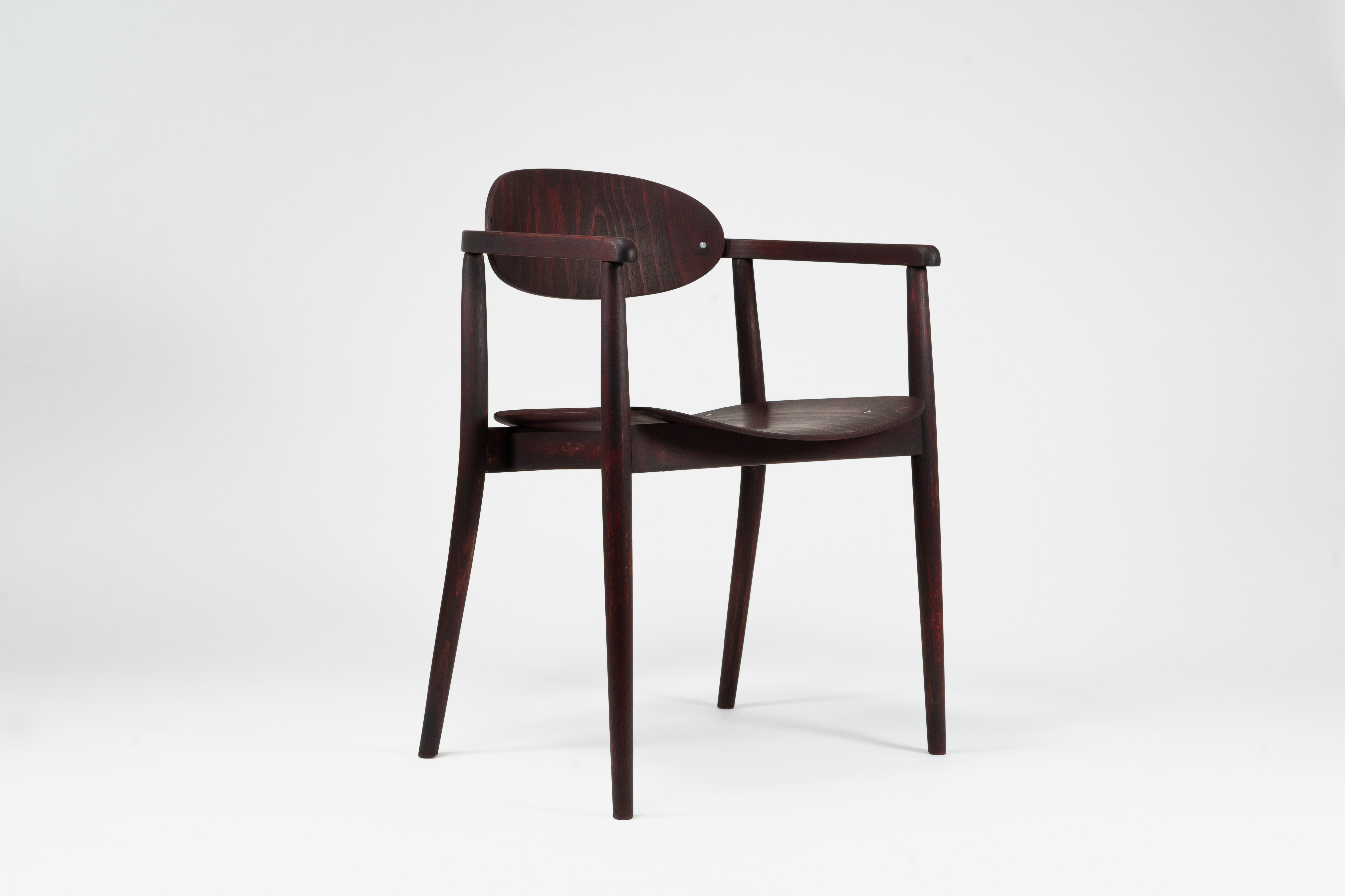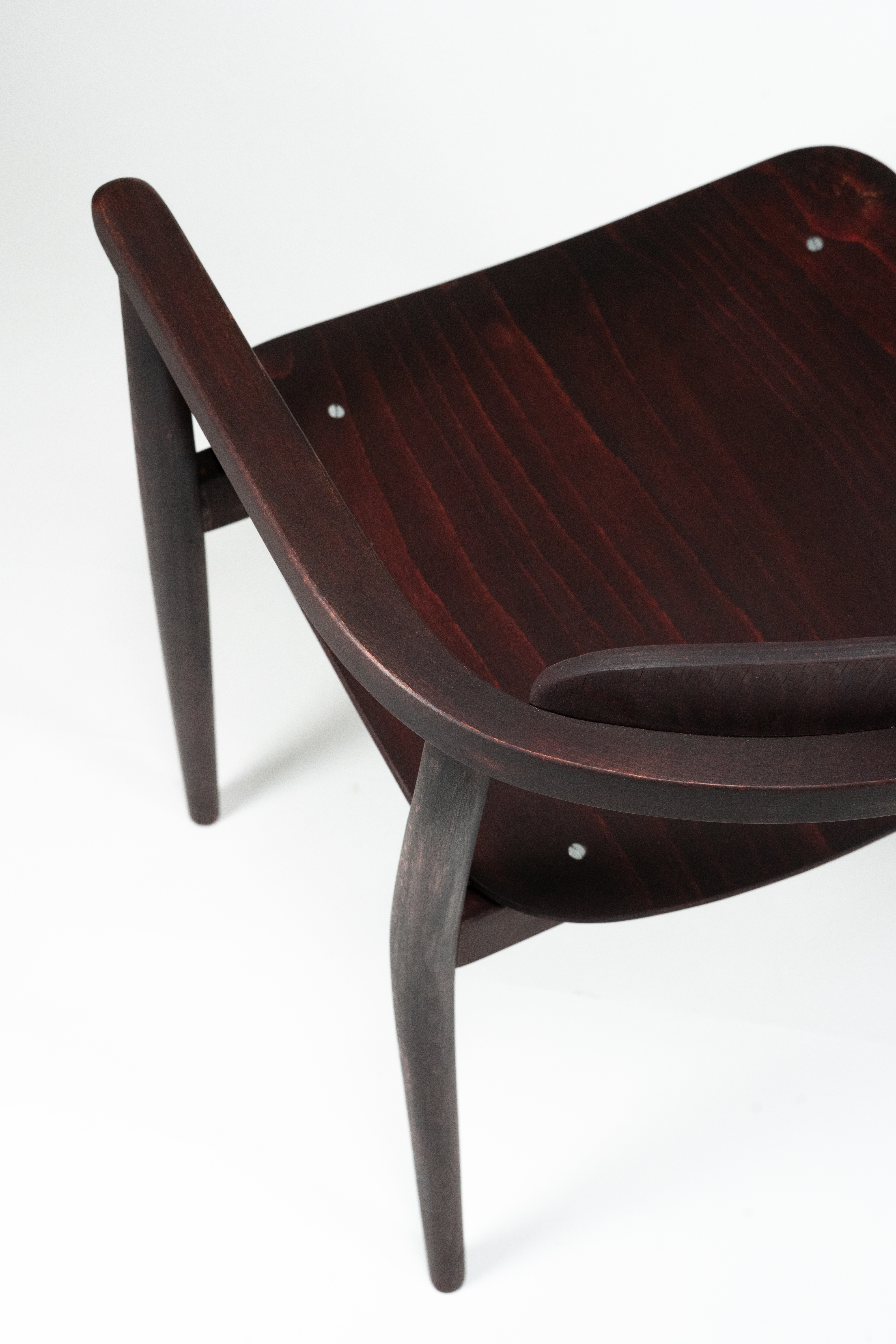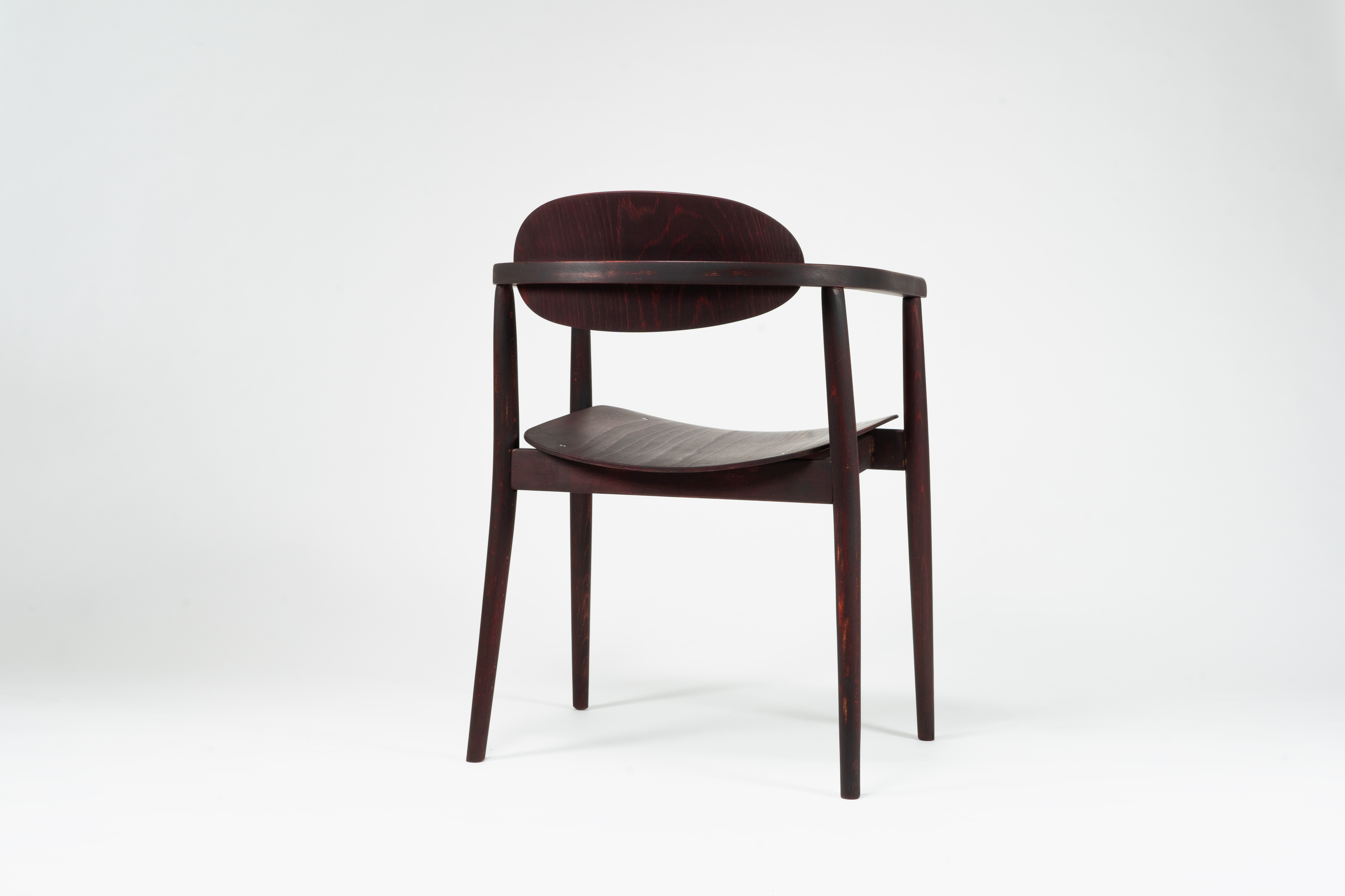 Toto elegantní křeslo kombinuje bukový masiv s ohýbanou překližkou tvořící sedák a opěradlo. Jemně zakřivené linie a subtilní konstrukce odkazují na skandinávskou inspiraci, přesto si uchovávají typicky československý charakter.