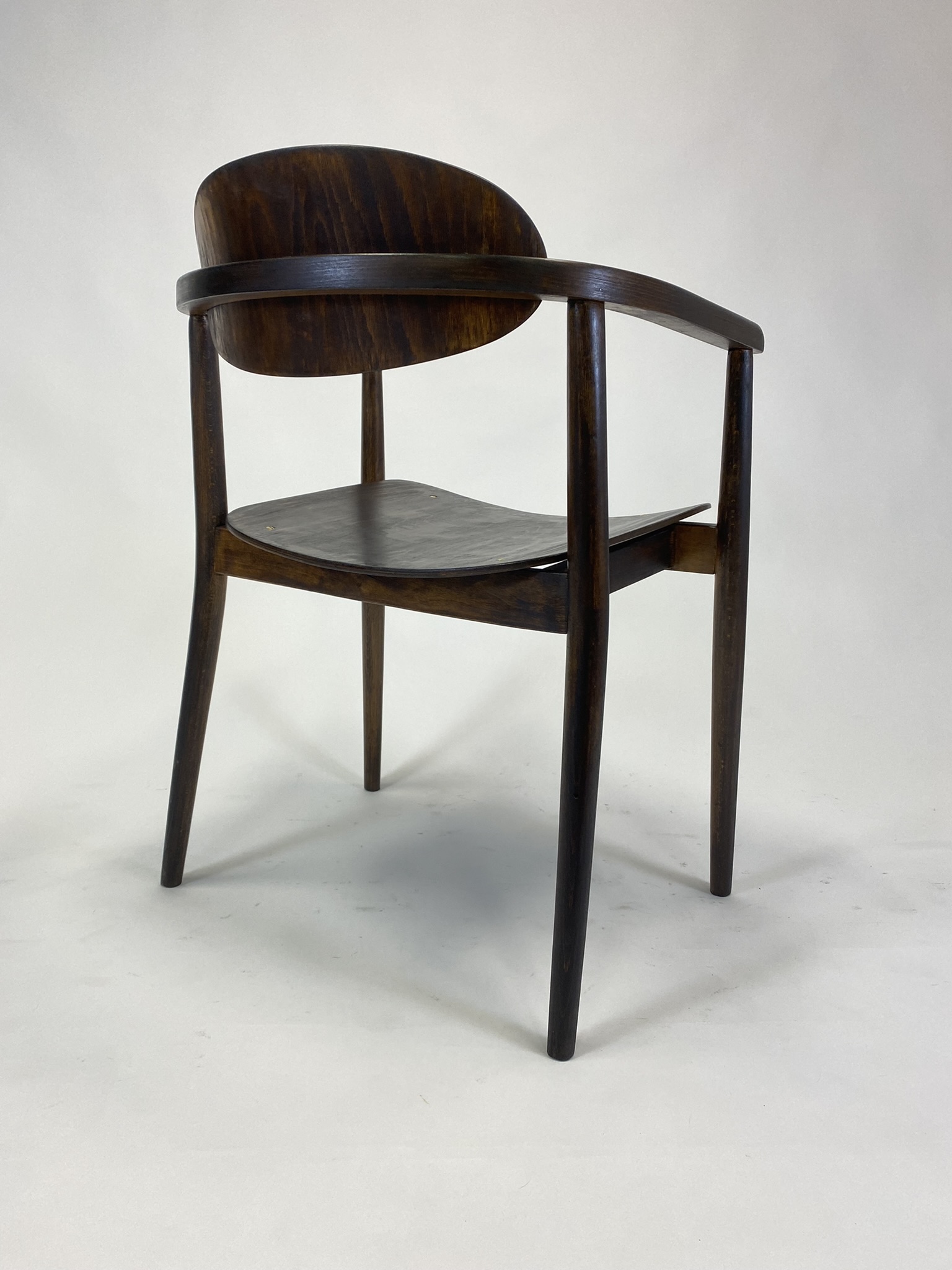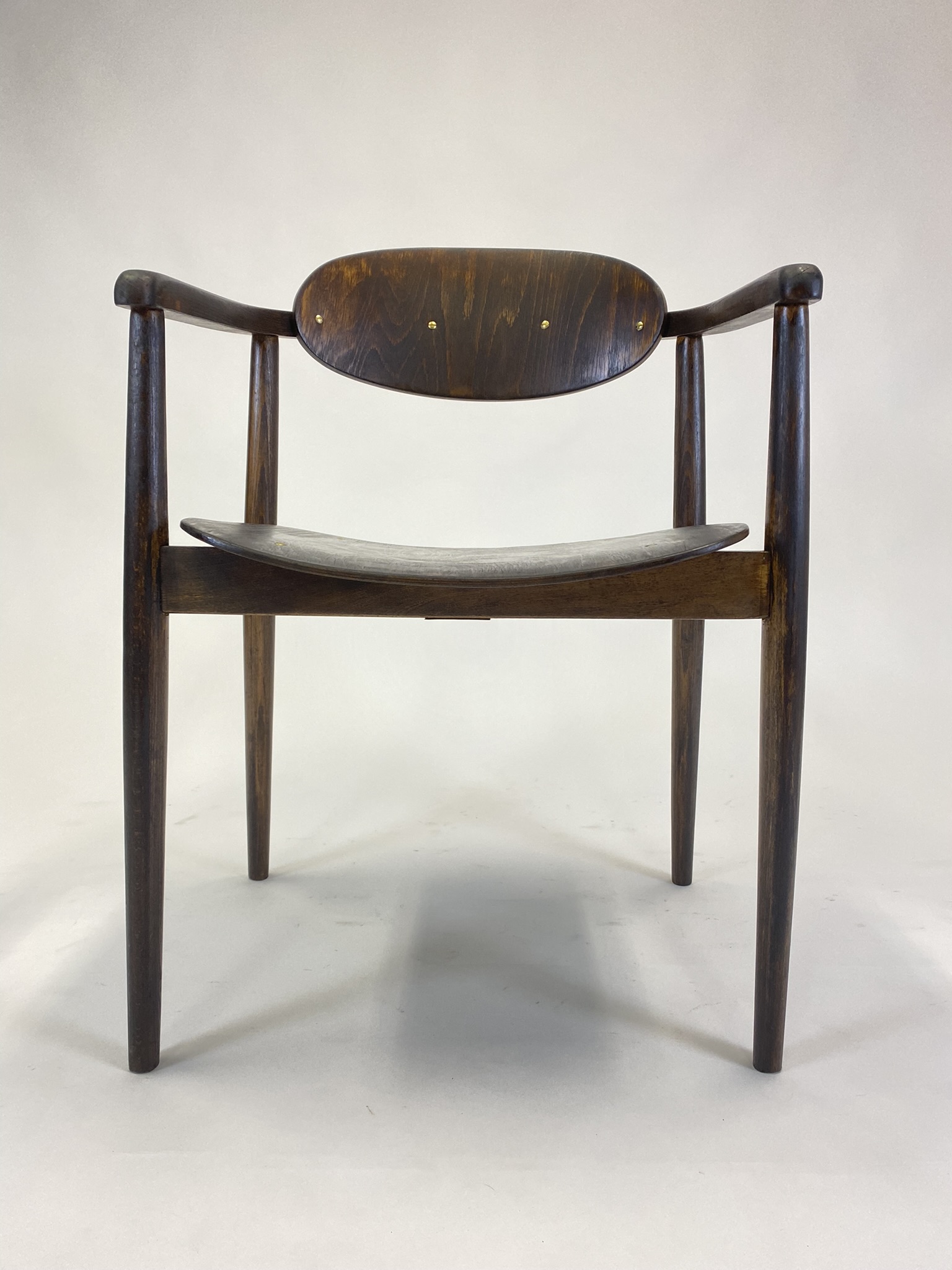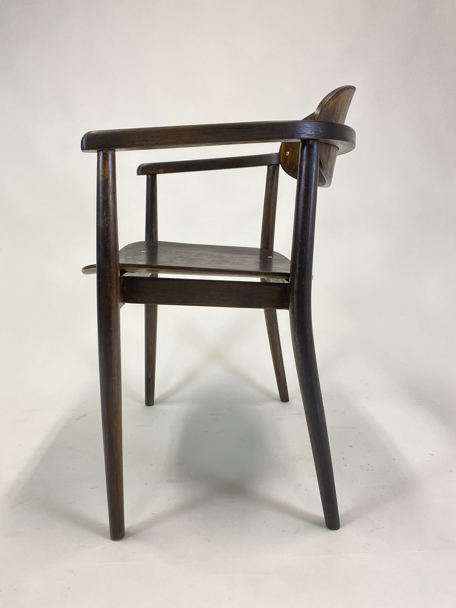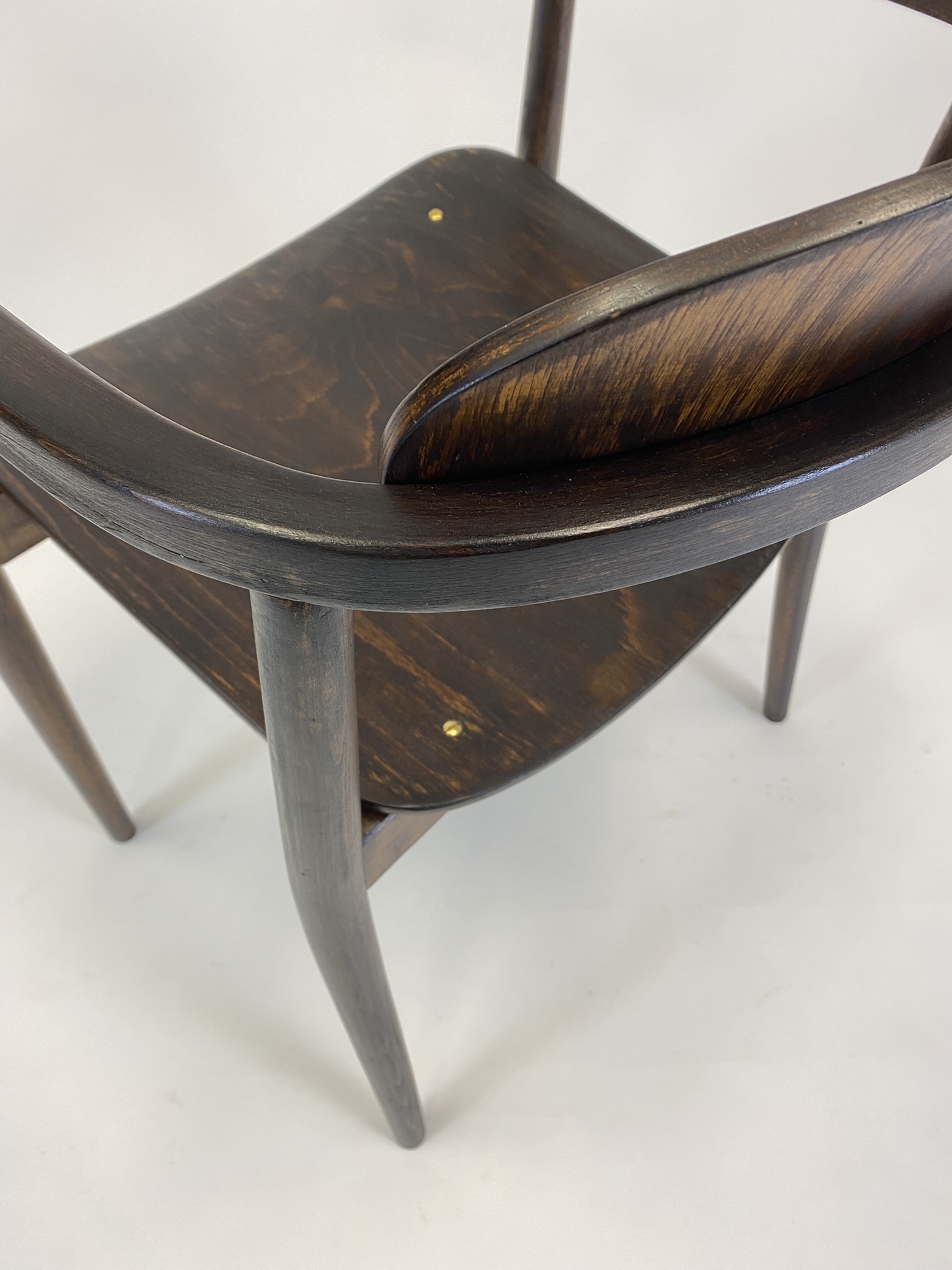 Toto elegantní křeslo kombinuje bukový masiv s ohýbanou překližkou tvořící sedák a opěradlo. Jemně zakřivené linie a subtilní konstrukce odkazují na skandinávskou inspiraci, přesto si uchovávají typicky československý charakter.