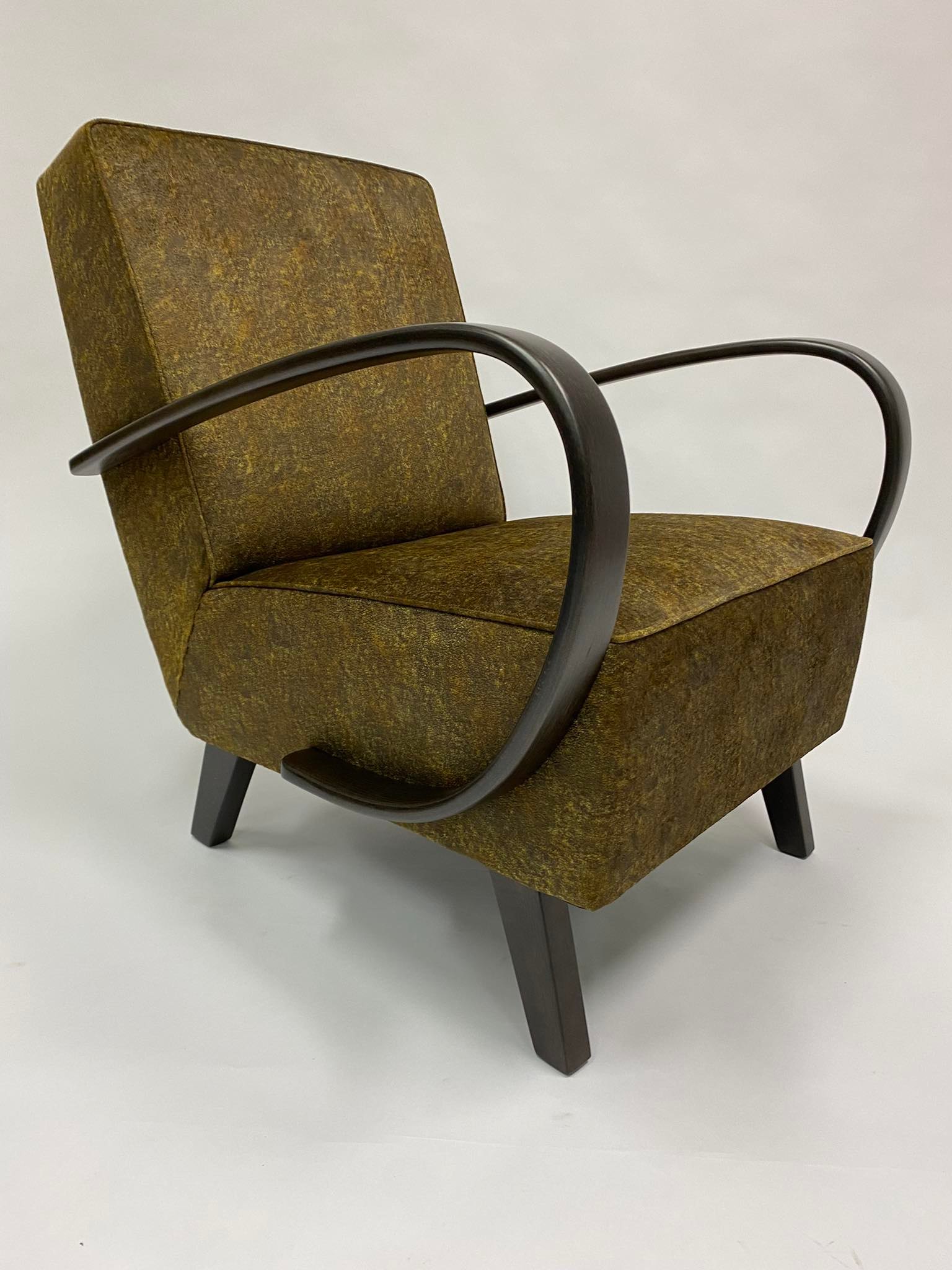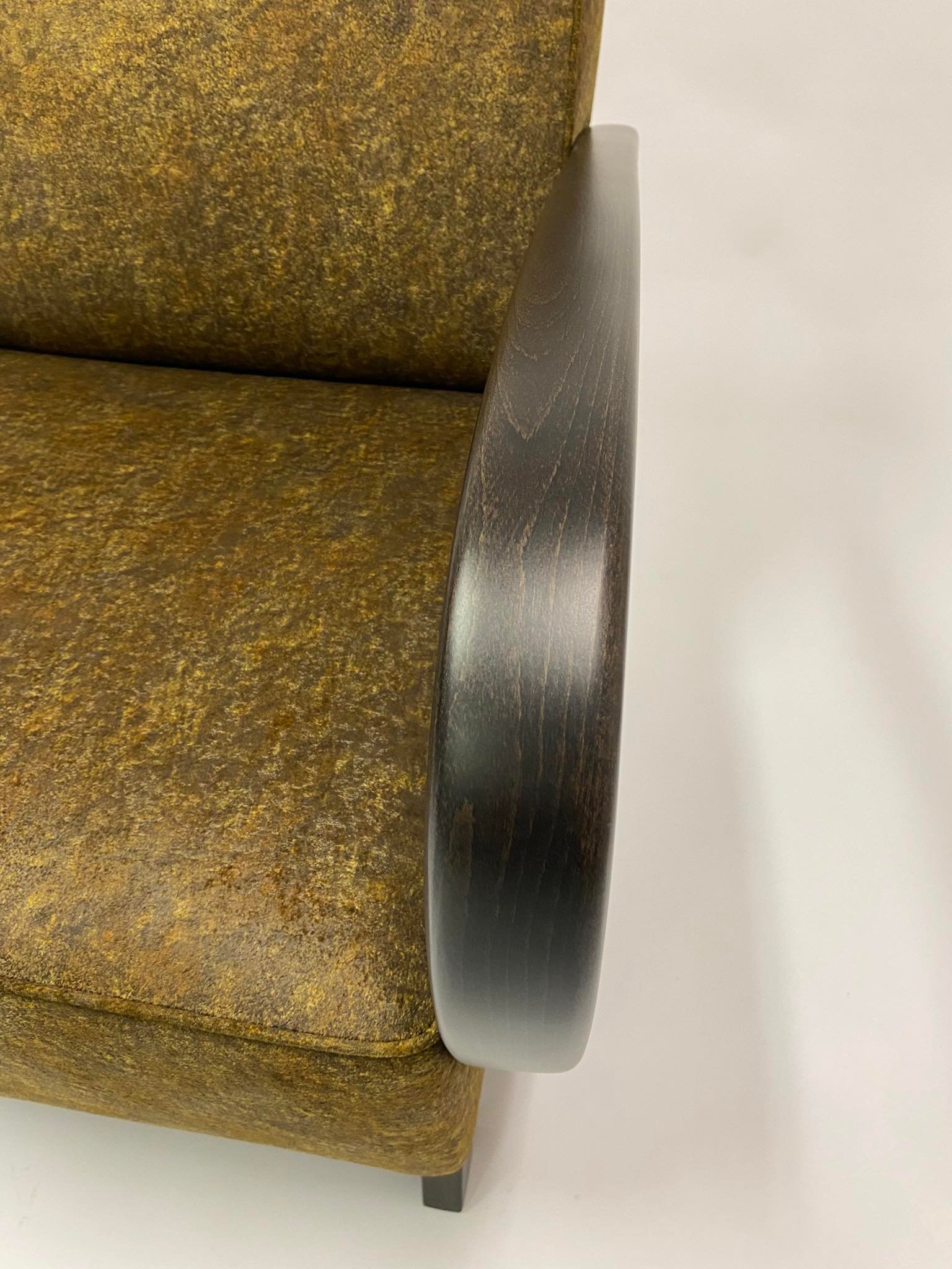 Tento exemplář prošel kompletní renovací: dřevěná konstrukce byla odborně zrestaurována a opatřena novou povrchovou úpravou, sedák i opěrák byly nově očalouněny kvalitní italskou látkou v odstínu olivově zelené s jemným strukturovaným efektem.