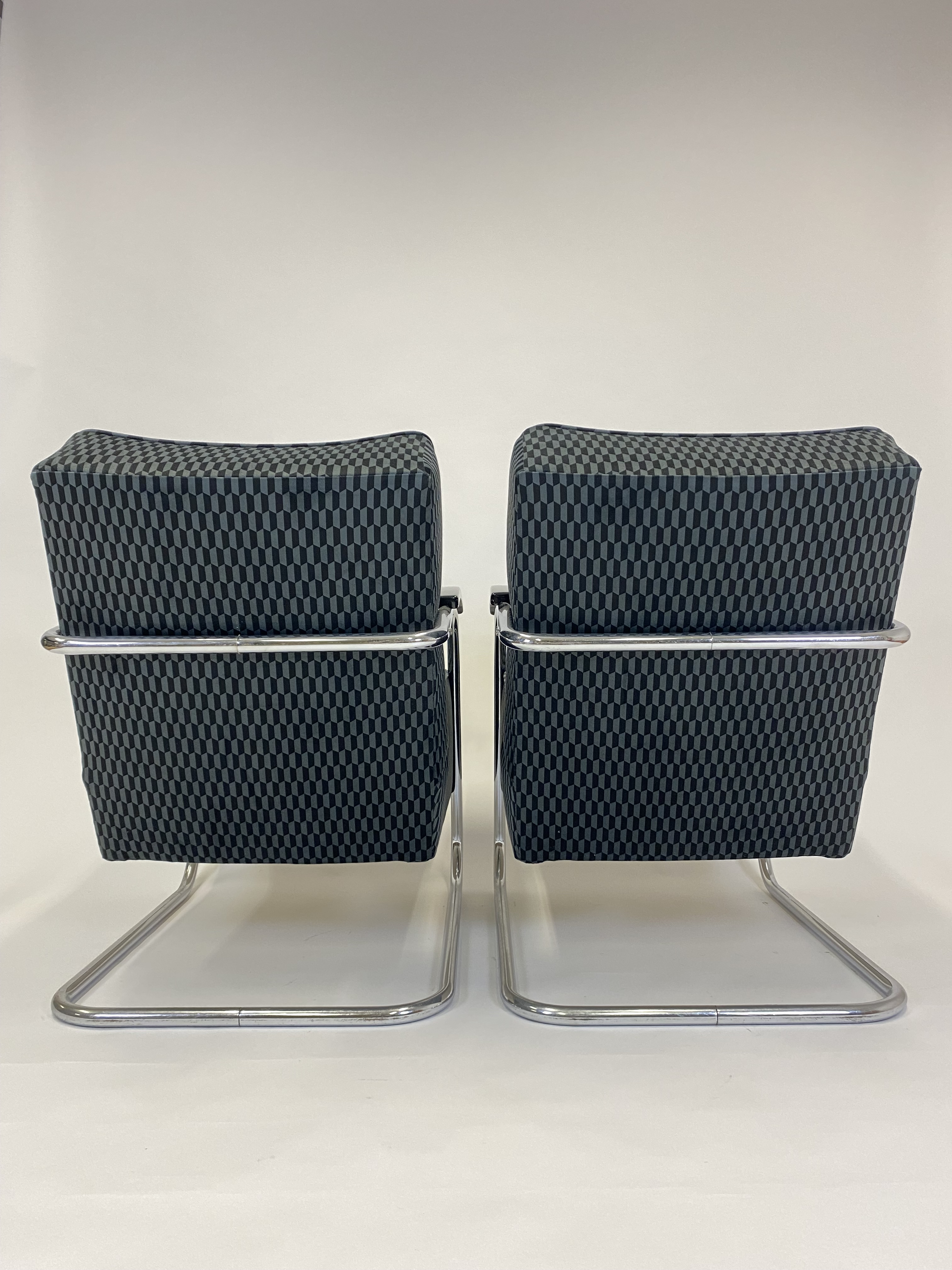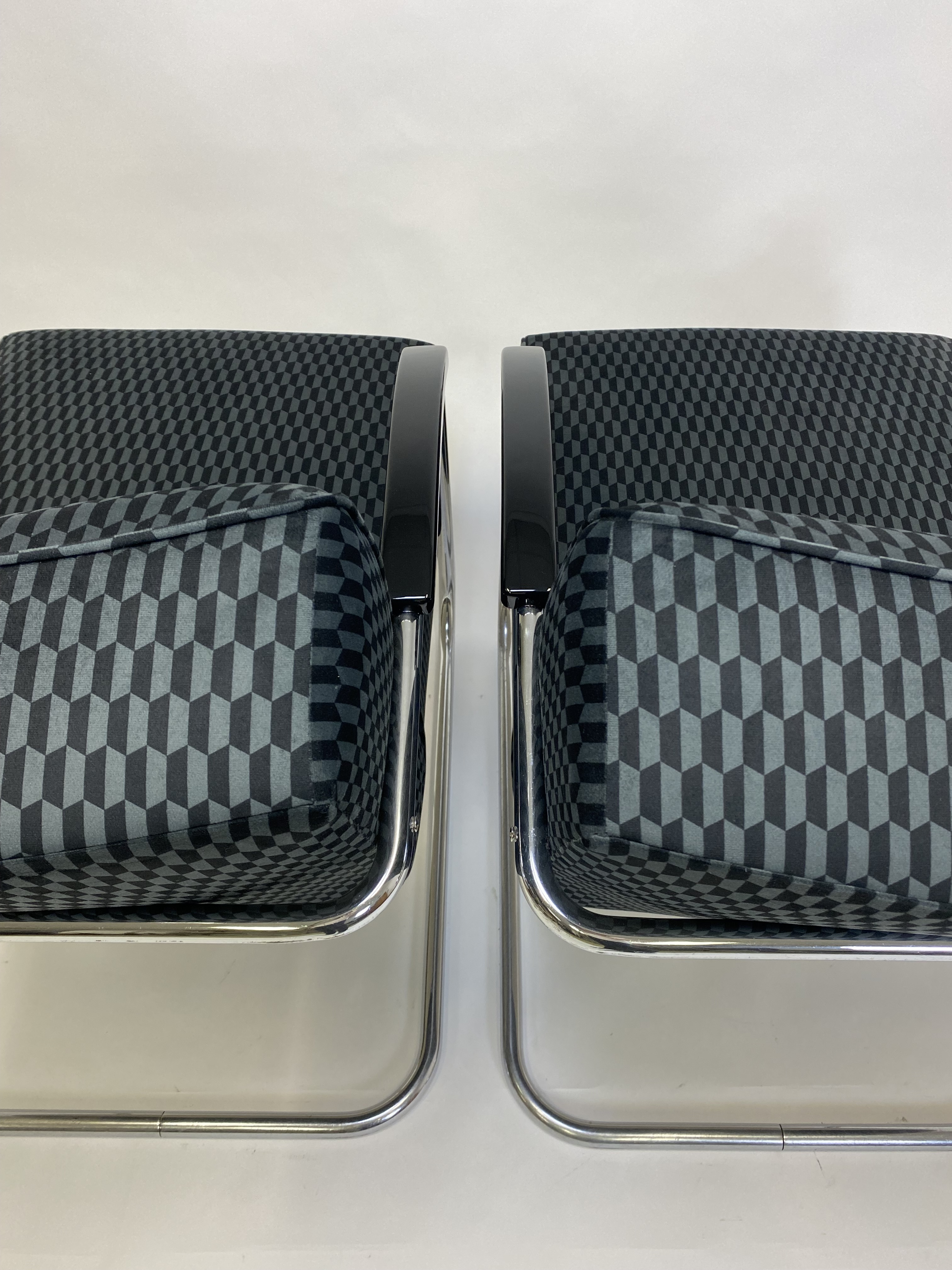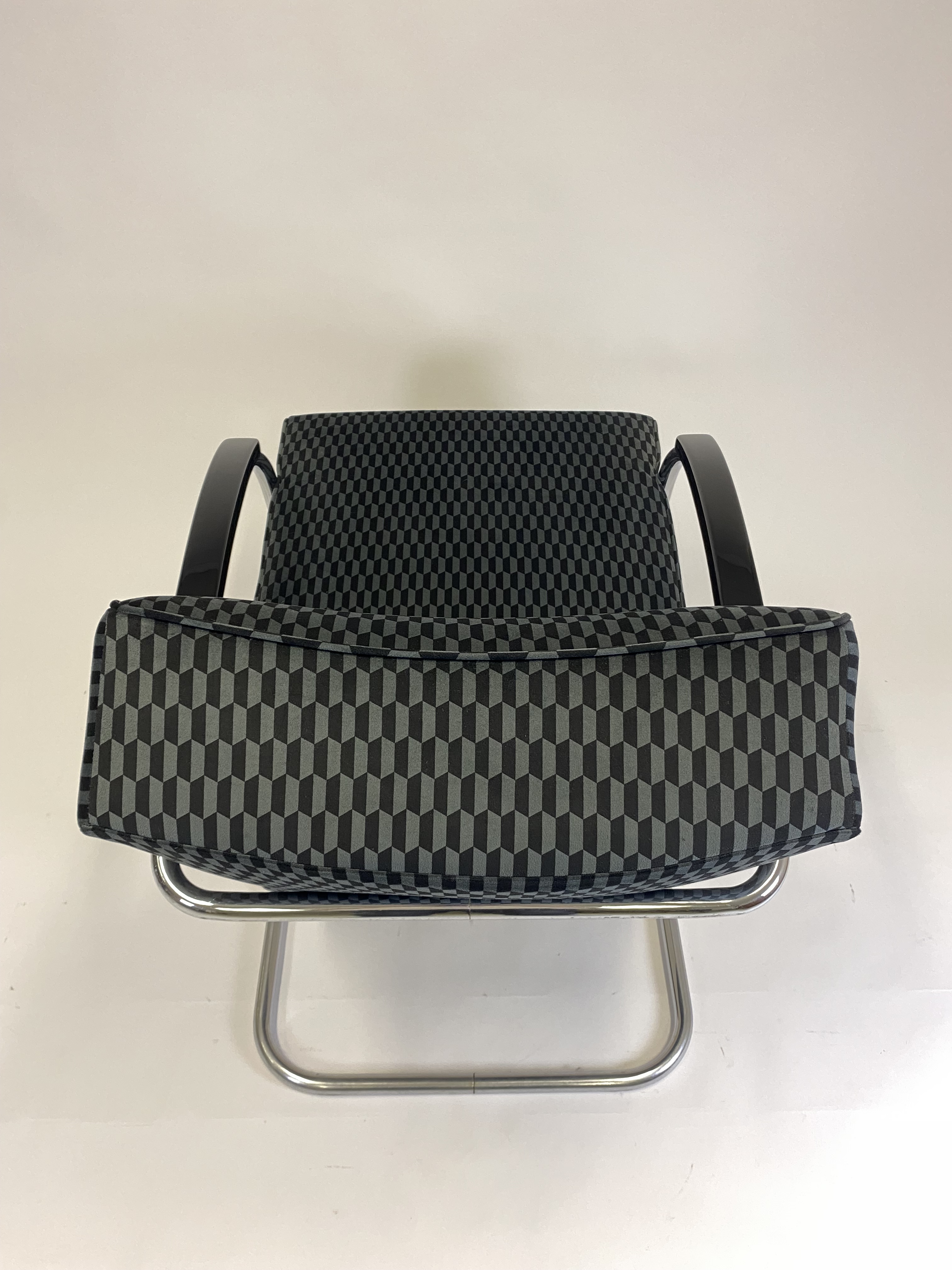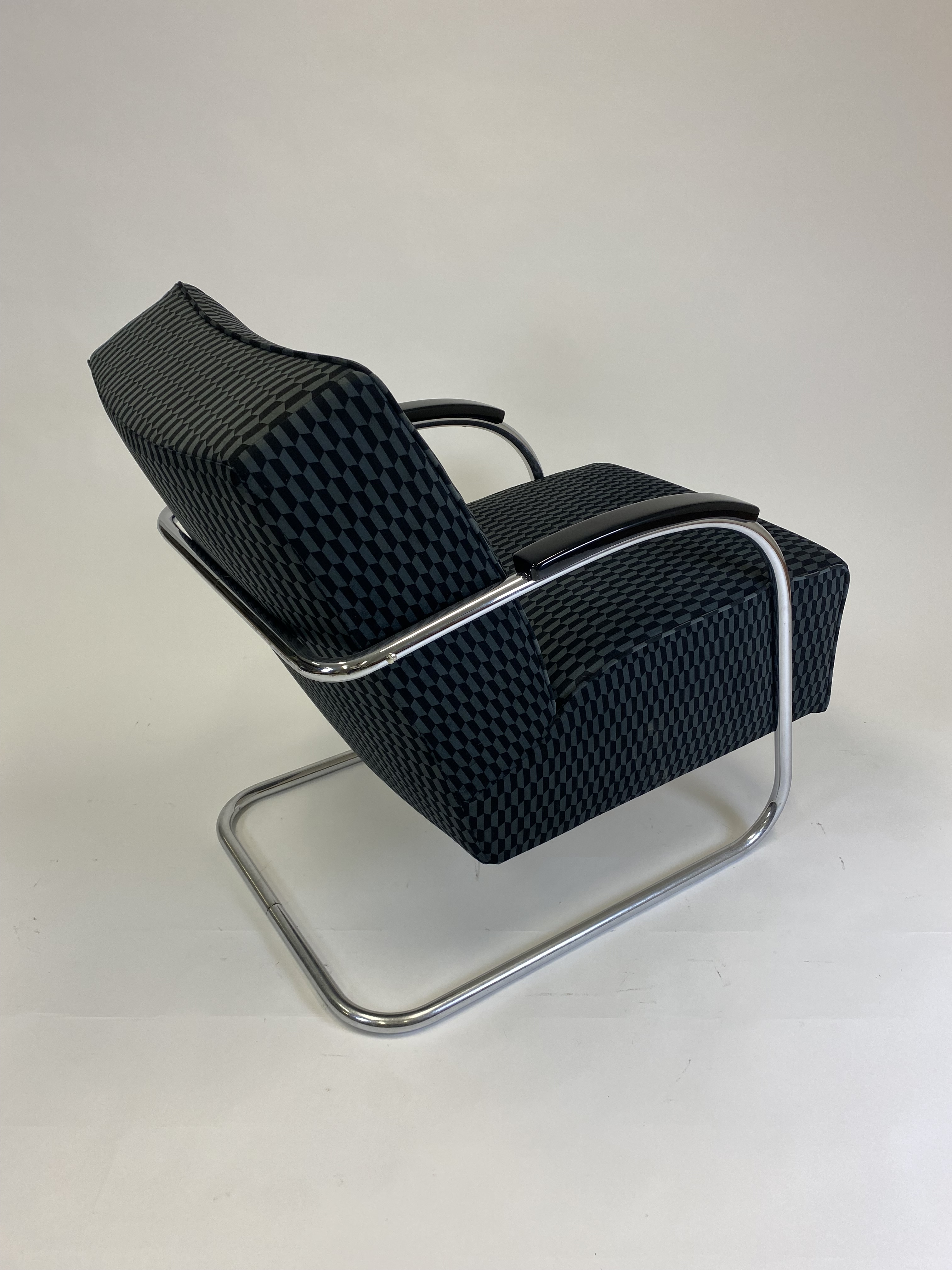 Tato dvojice konzolových křesel s chromovanou ocelovou konstrukcí a elegantně zakřivenými područkami je ukázkou precizního řemesla a nadčasového designu. Originálná sedáky a opěradla byla kompletně zrenovována a čalouněna látkou s geometrickým vzorem, která podtrhuje modernistický charakter. Komfortní sezení v kombinaci s vizuální lehkostí činí z těchto křesel ideální kus do interiéru laděného ve stylu funkcionalismu, modernismu nebo současného minimalismu.