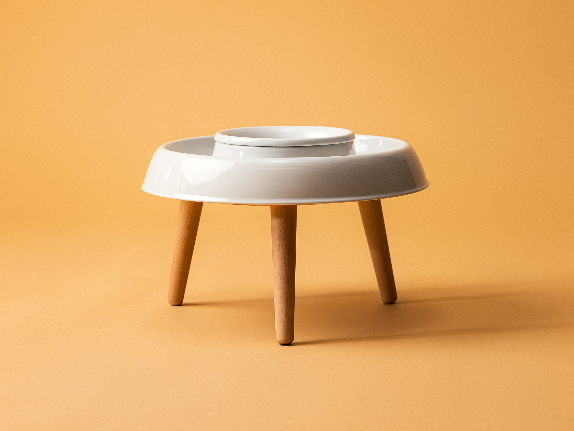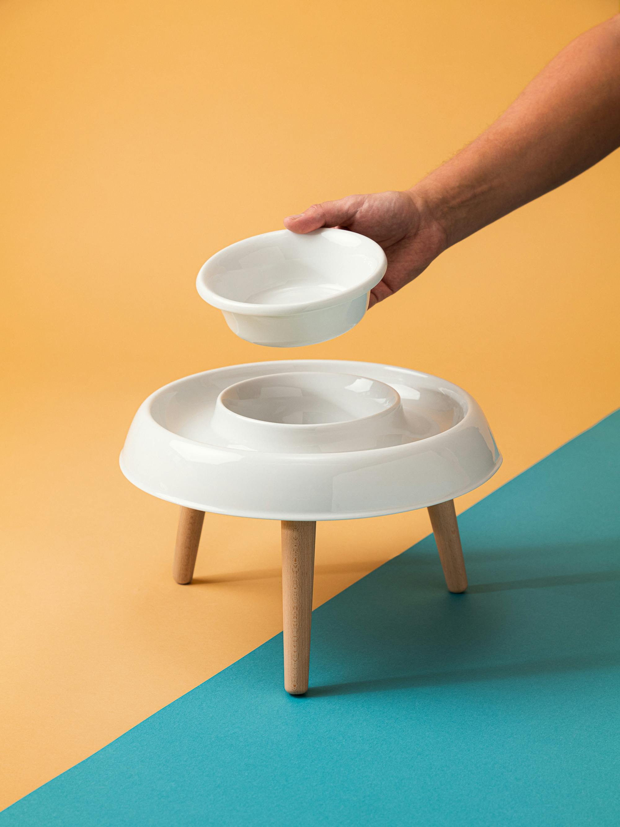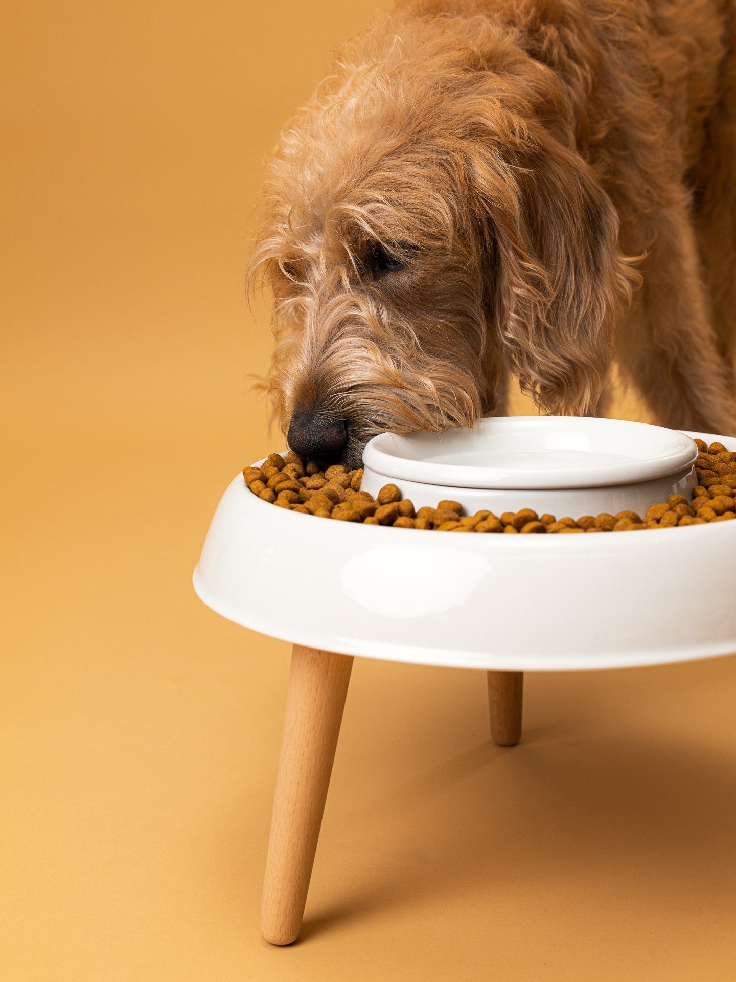 Vyvýšená konstrukce z bukového dřeva a ergonomicky tvarovaný porcelán podporují zdravé držení těla při krmení, je protihltací a zlepšují trávení. Díky dvěma výškám (17 a 23 cm) se miska snadno přizpůsobí velikosti i věku zvířete.
