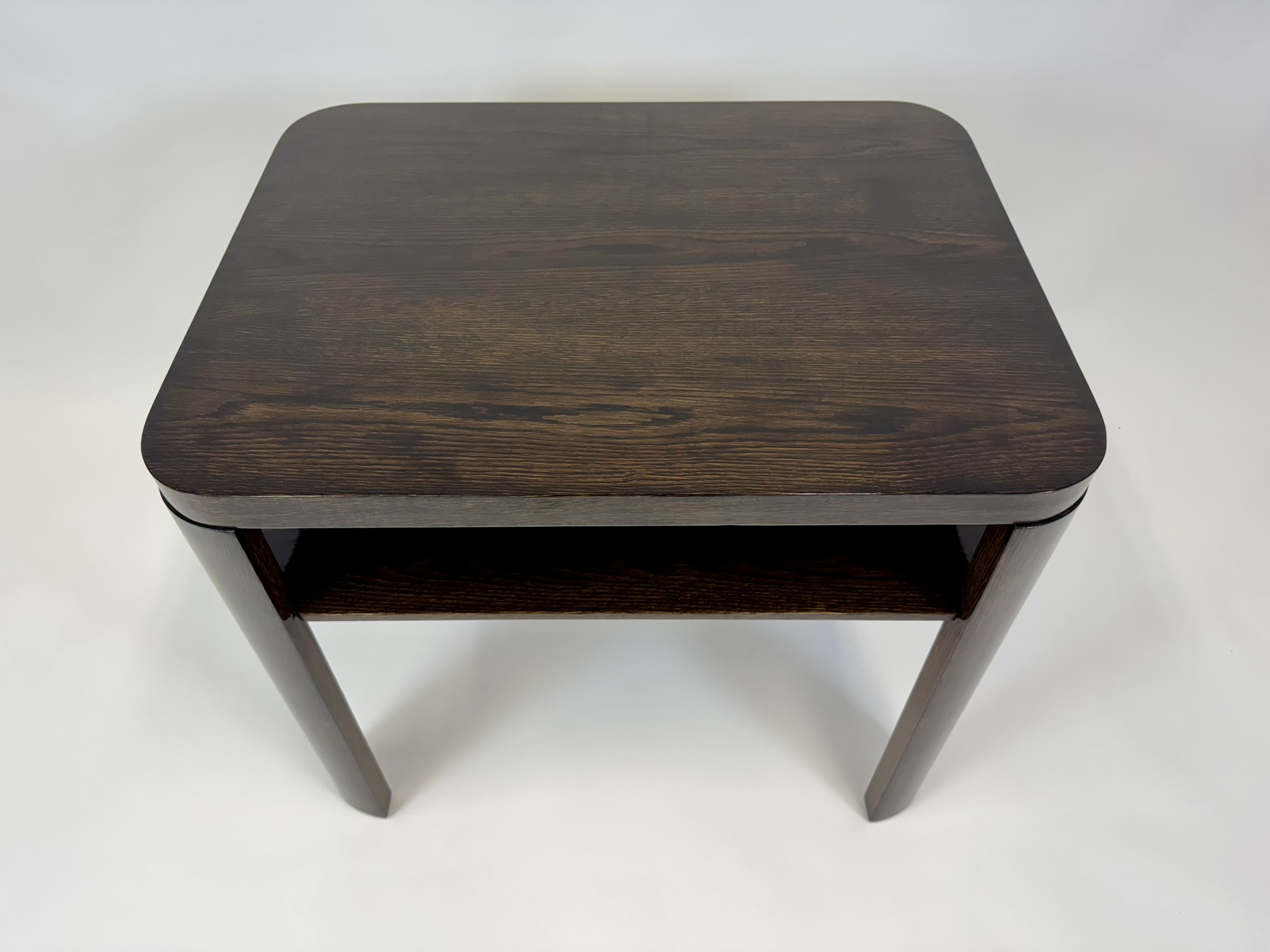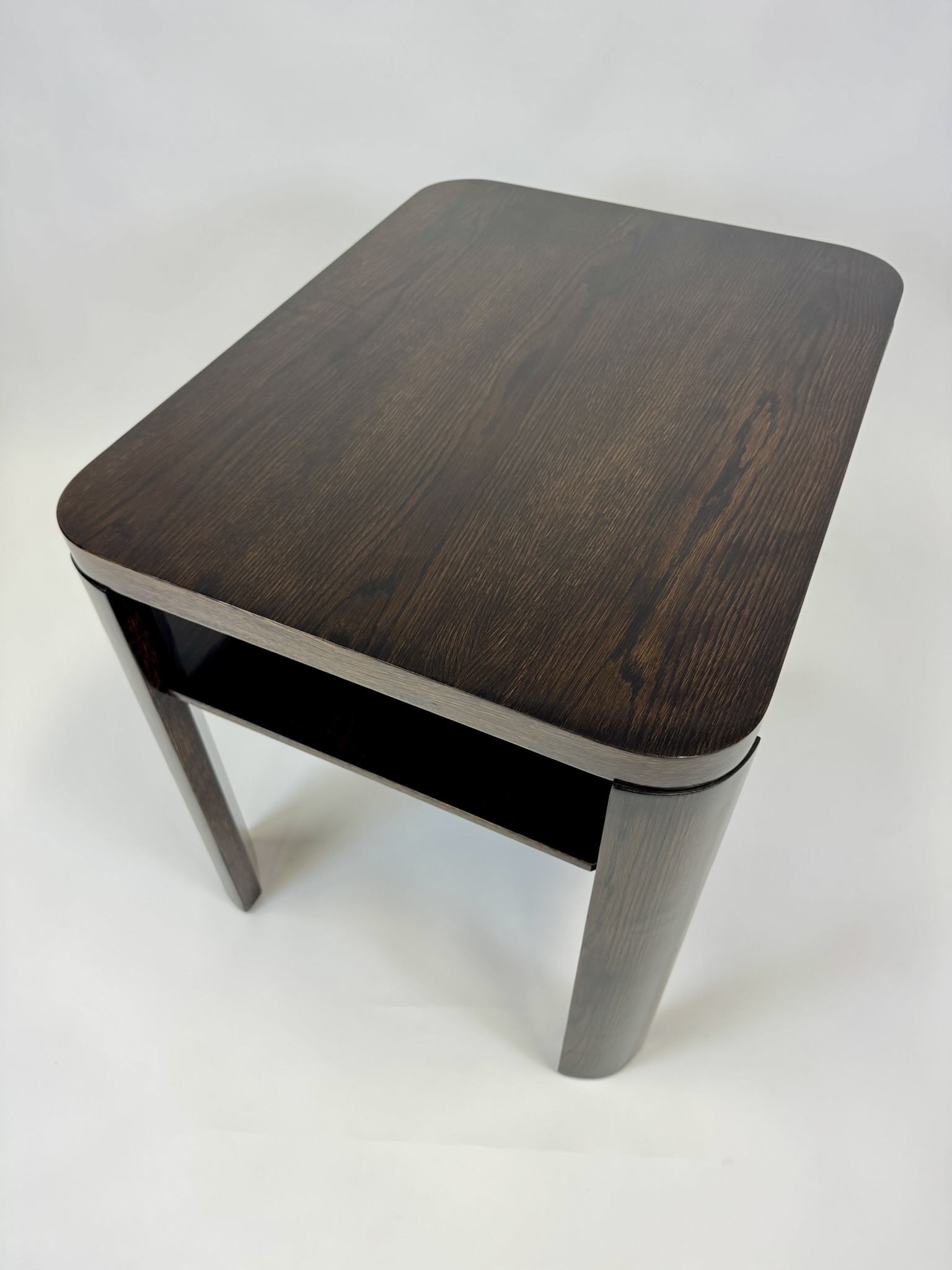 Stolek prošel kompletní náročnou renovací. Povrchová úprava je provedena tradiční šelakovou politurou, která zvýrazňuje krásnou kresbu dýhy a dodává dřevu hedvábný lesk. Výsledkem je elegantní, reprezentativní kus, který zaujme jak ve sbírce, tak v moderním interiéru.