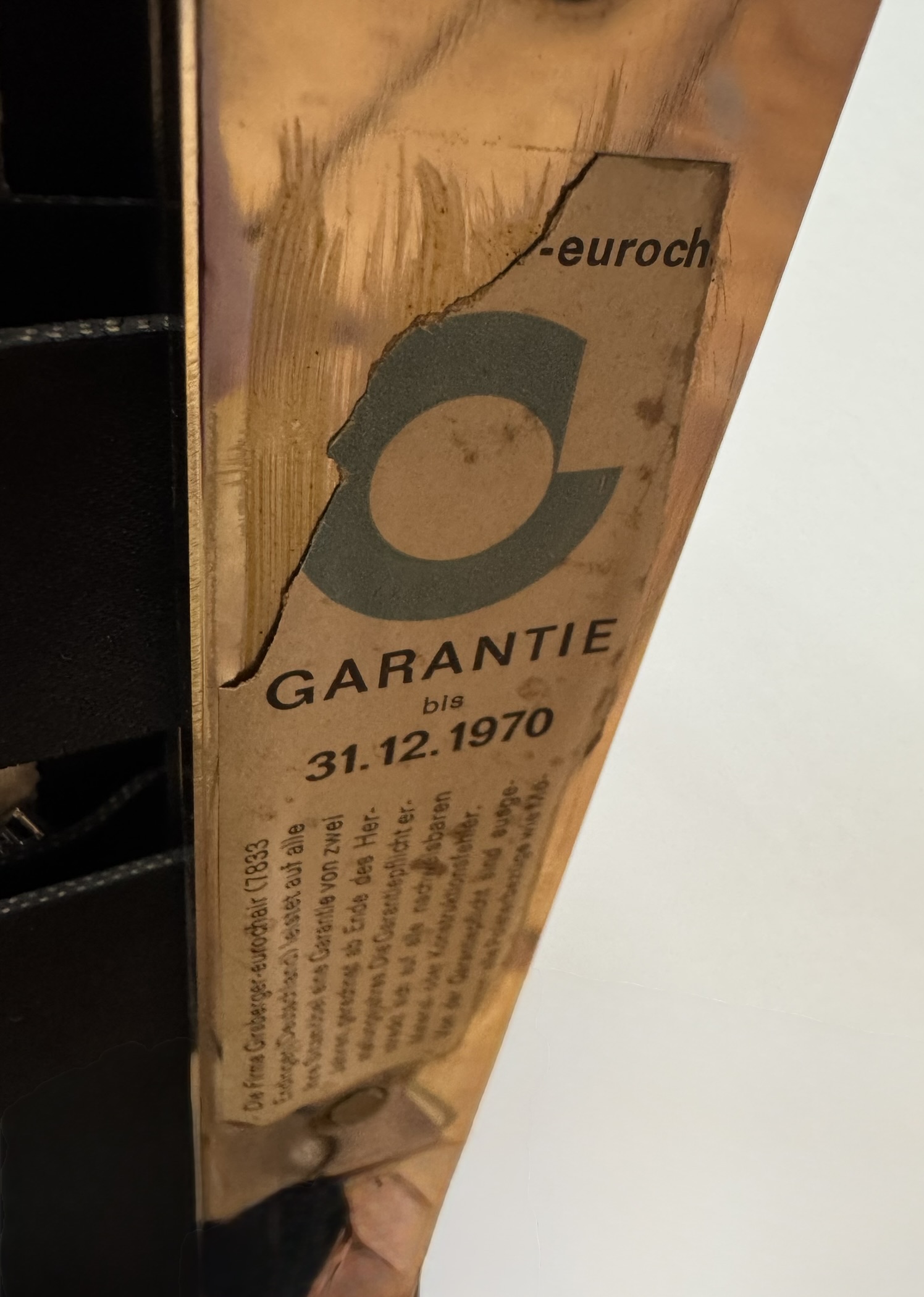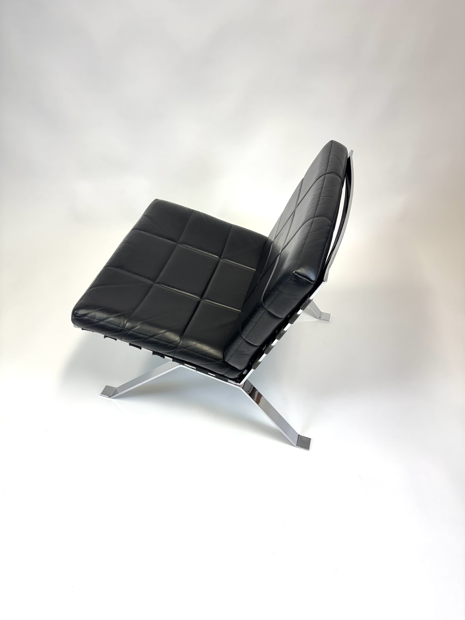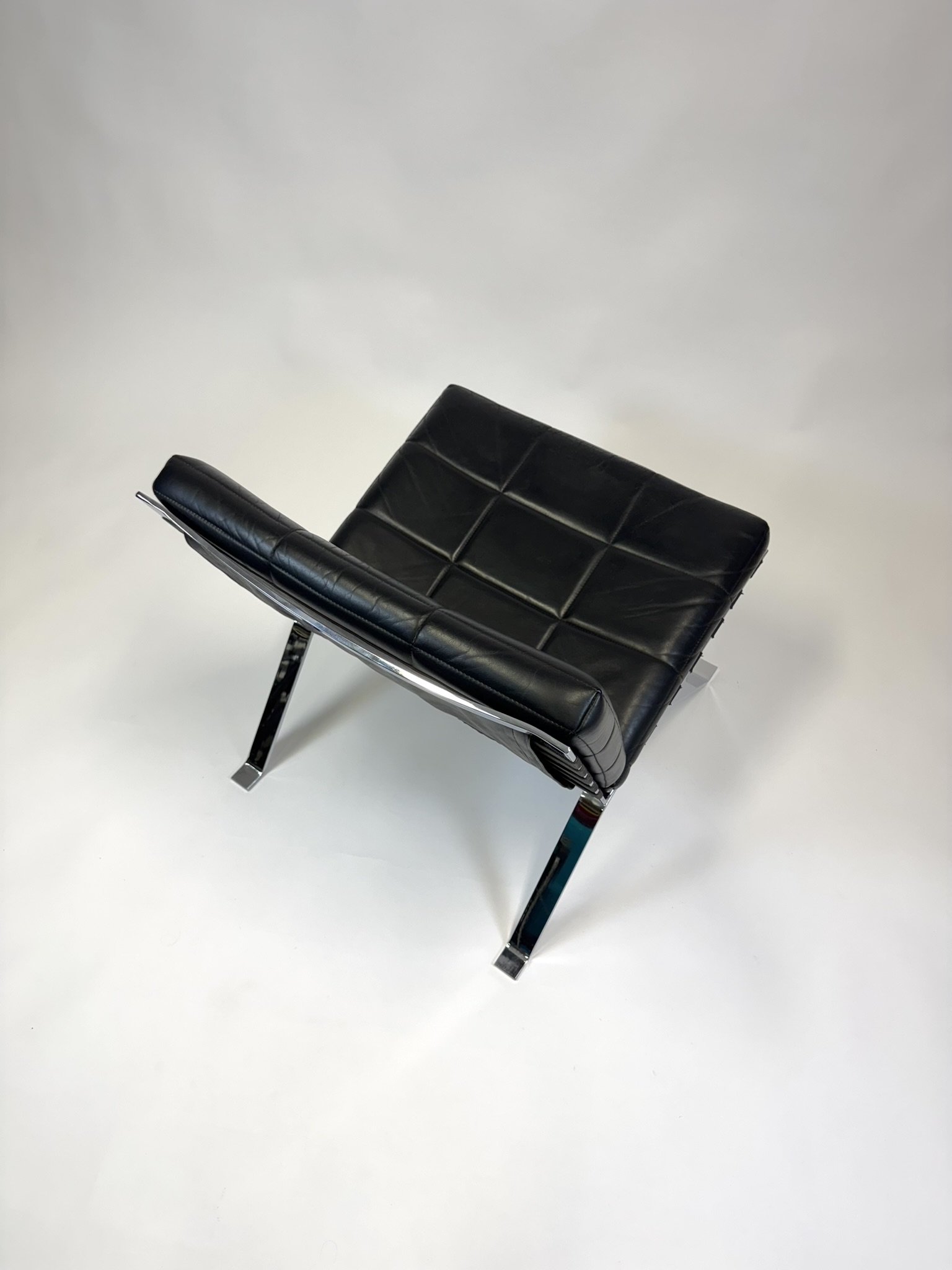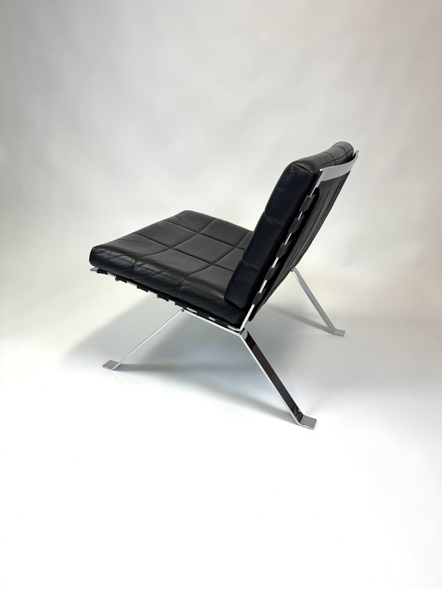Křeslo má originální chromovanou ocelovou konstrukci s elegantně zkosenými nohami a původní kožené čalounění v černé barvě s charakteristickým čtvercovým prošíváním. Na rámu je dochovaný původní štítek s garancí do roku 1970, který potvrzuje autenticitu a výrobní původ Girsberger Switzerland.