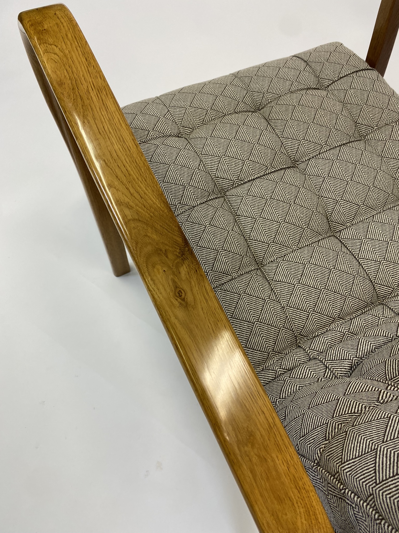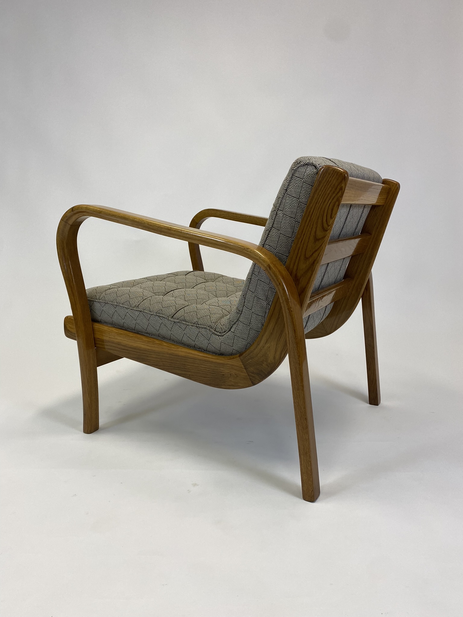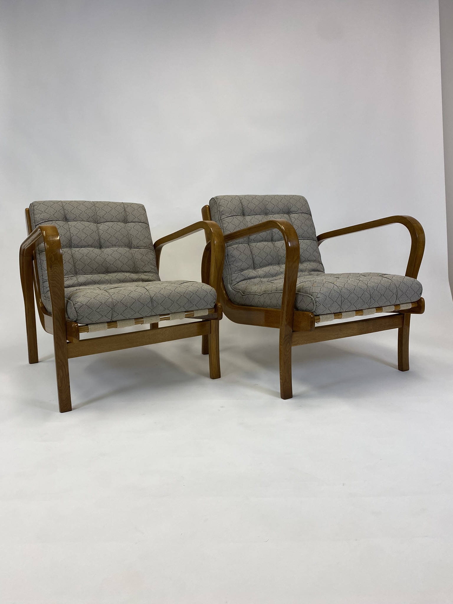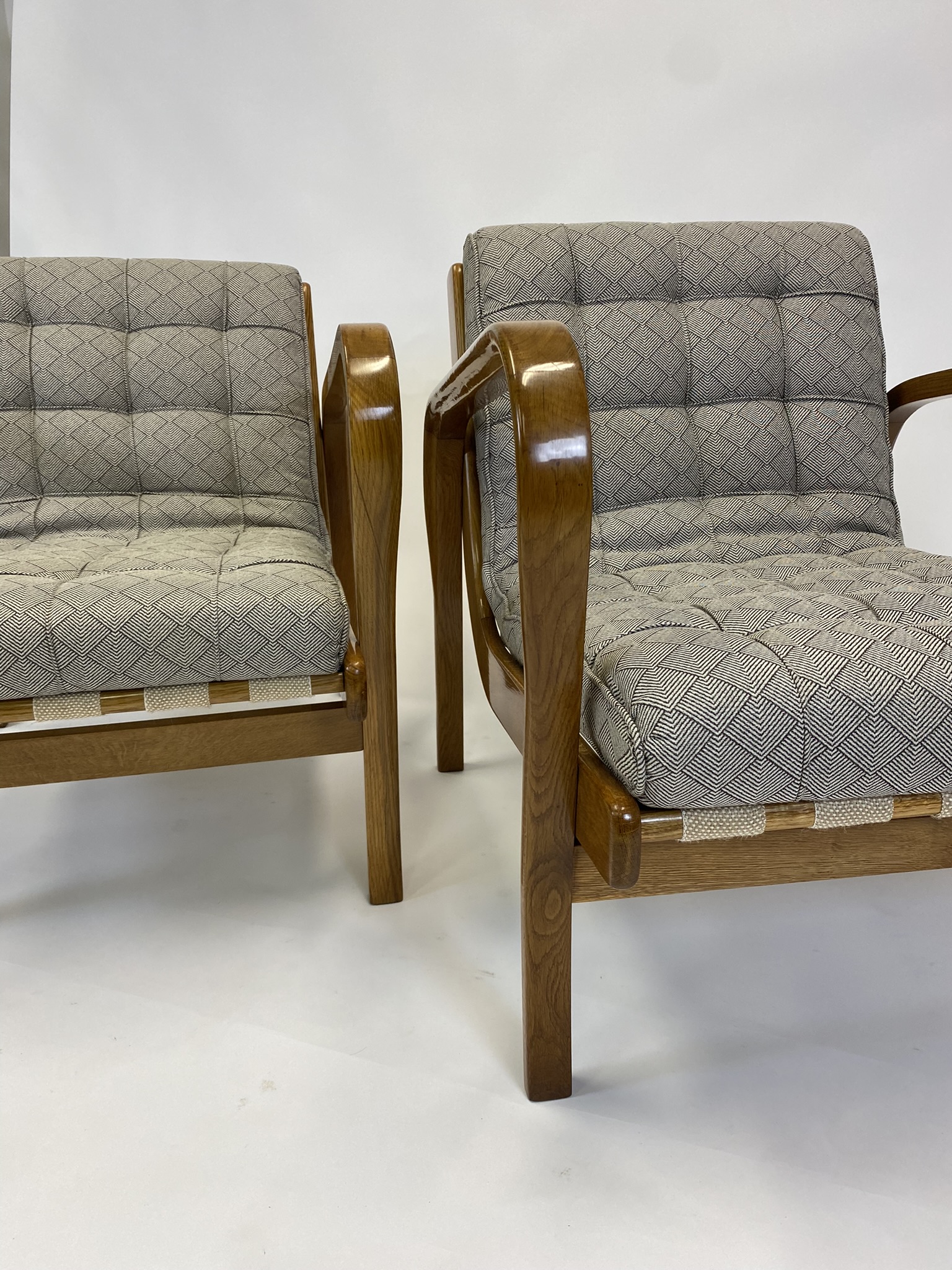 Představená křesla jsou málo vídanou variantou vyrobenou z dubového masivu, která se vymyká běžně dochovaným kusům z ohýbaného buku. Elegantní linie, promyšlená ergonomie a smysl pro detail ukazují typický rukopis dvojice Kropáček & Koželka, kteří dokázali propojit funkcionalismus s nadčasovou estetikou.