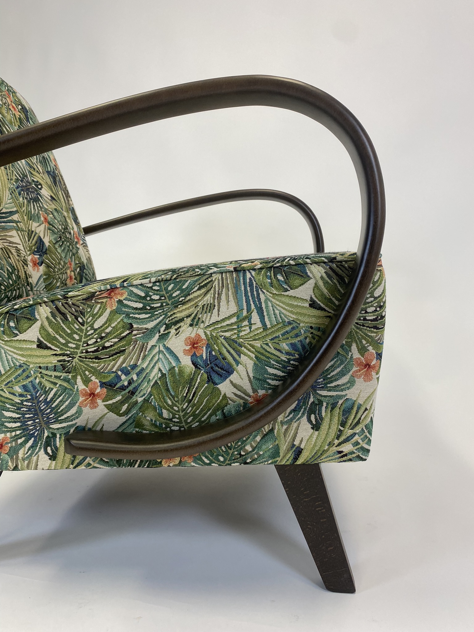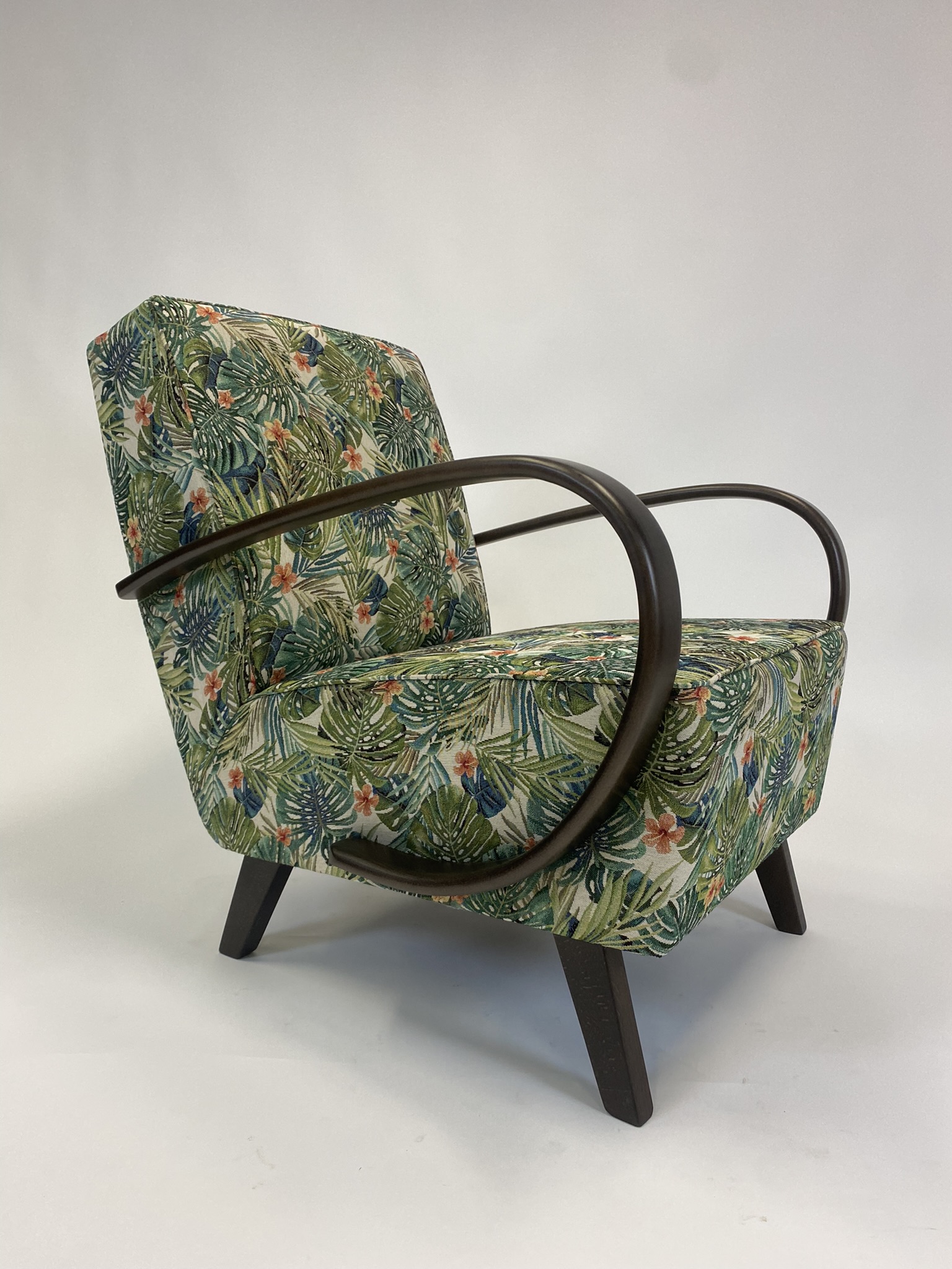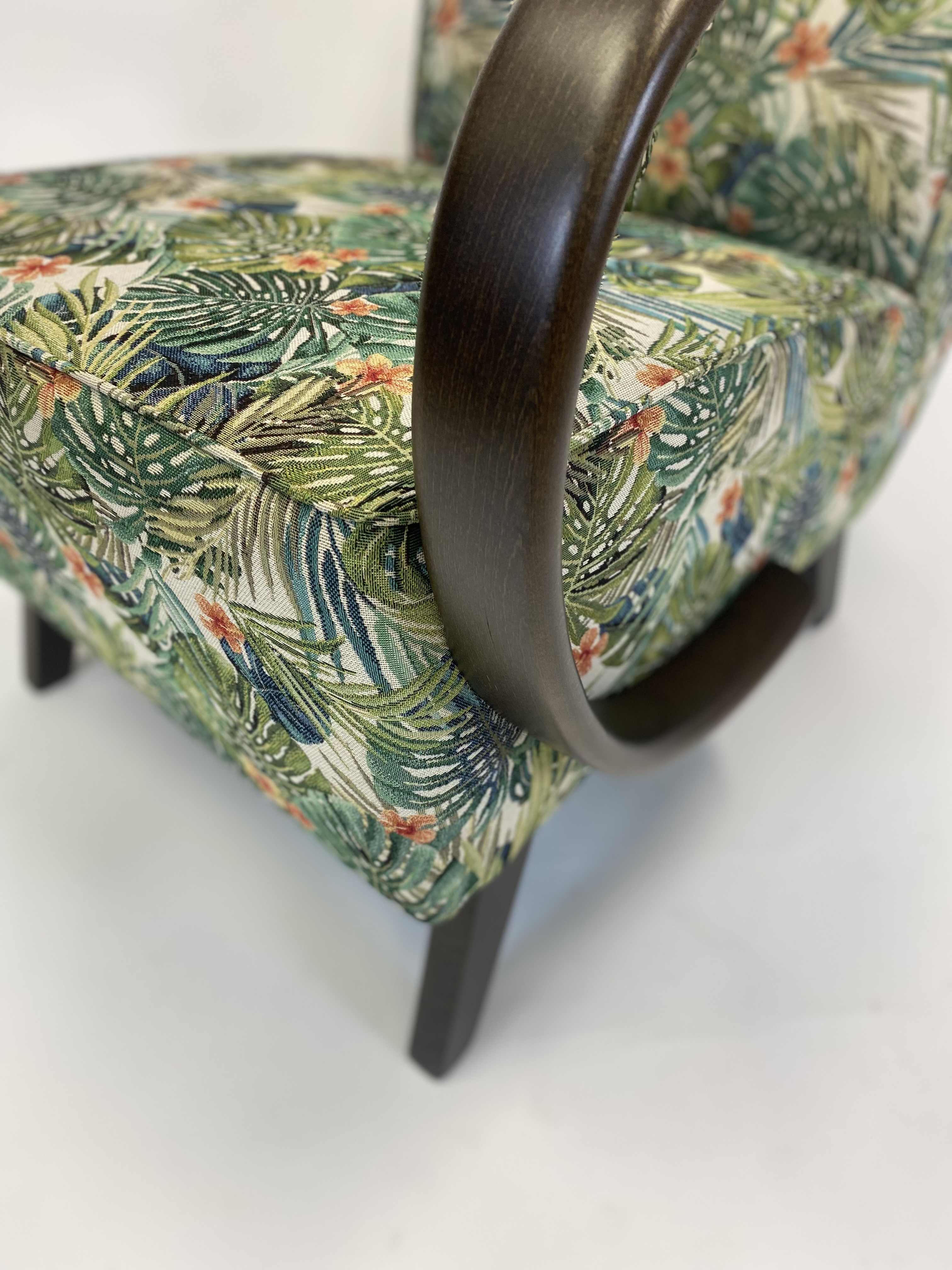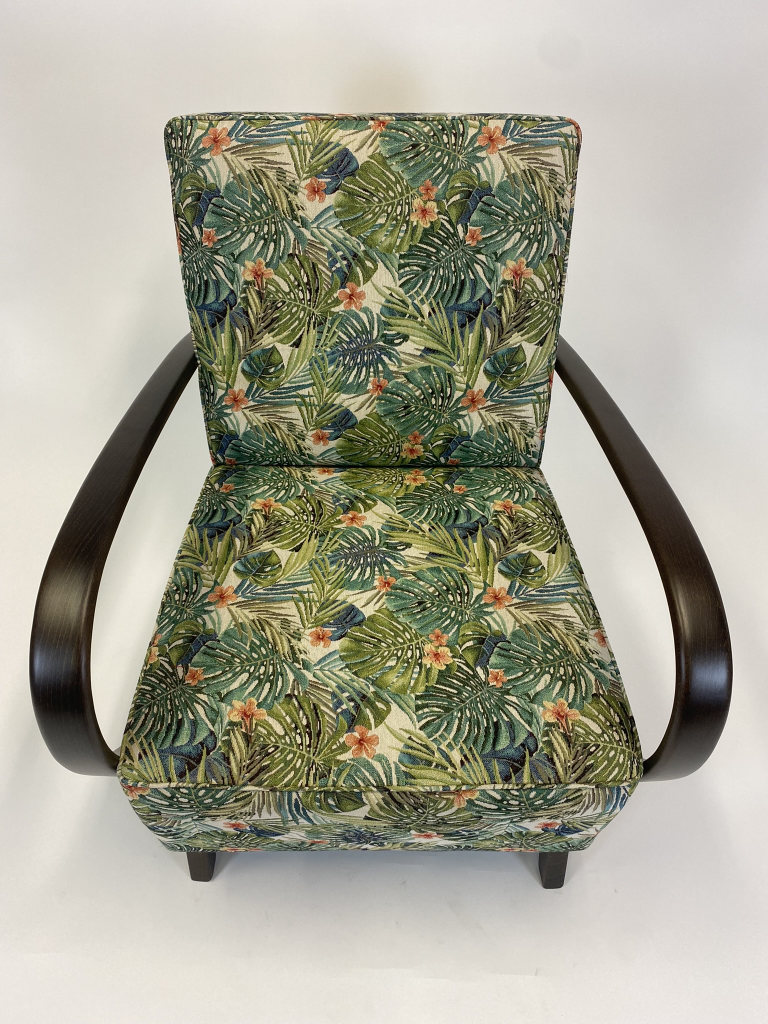 Nabízené křeslo prošlo kompletní renovací – původní konstrukce byla odborně repasována, dřevo znovu povrchově upraveno a čalounění nahrazeno novou látkou s geometrickým vzorem. Díky tomu nabízí nejen historickou hodnotu, ale i plnohodnotný komfort pro každodenní užívání.