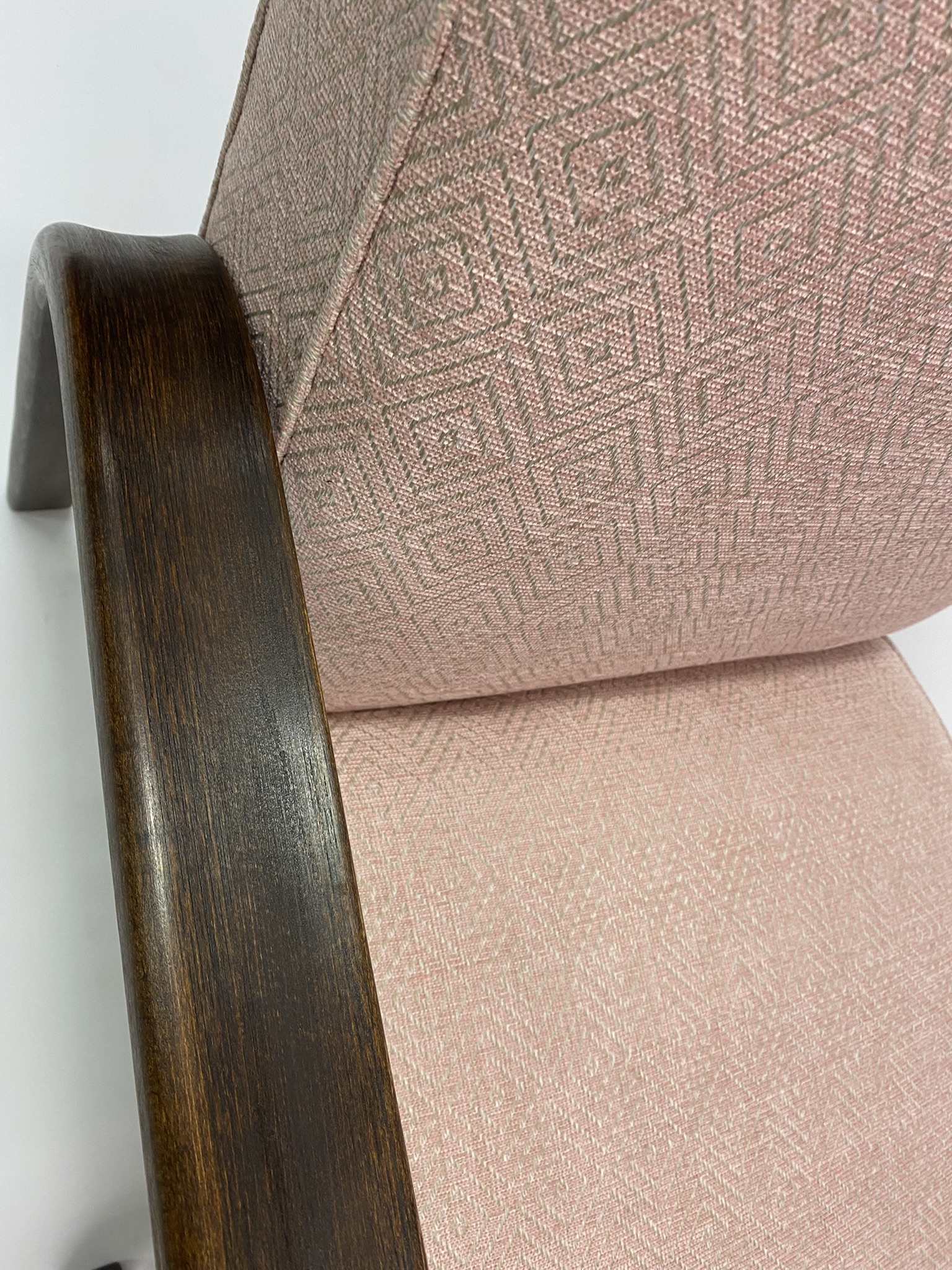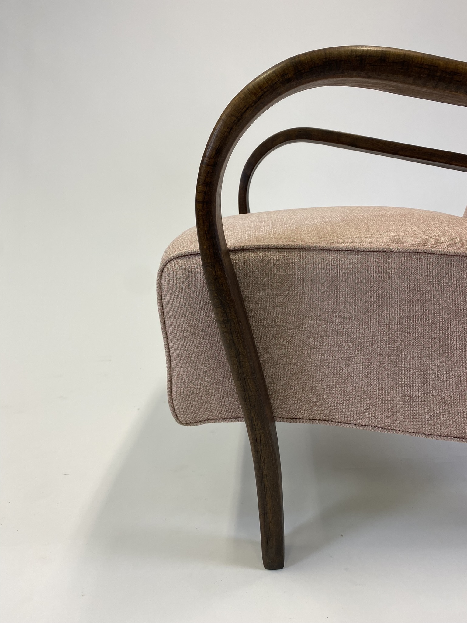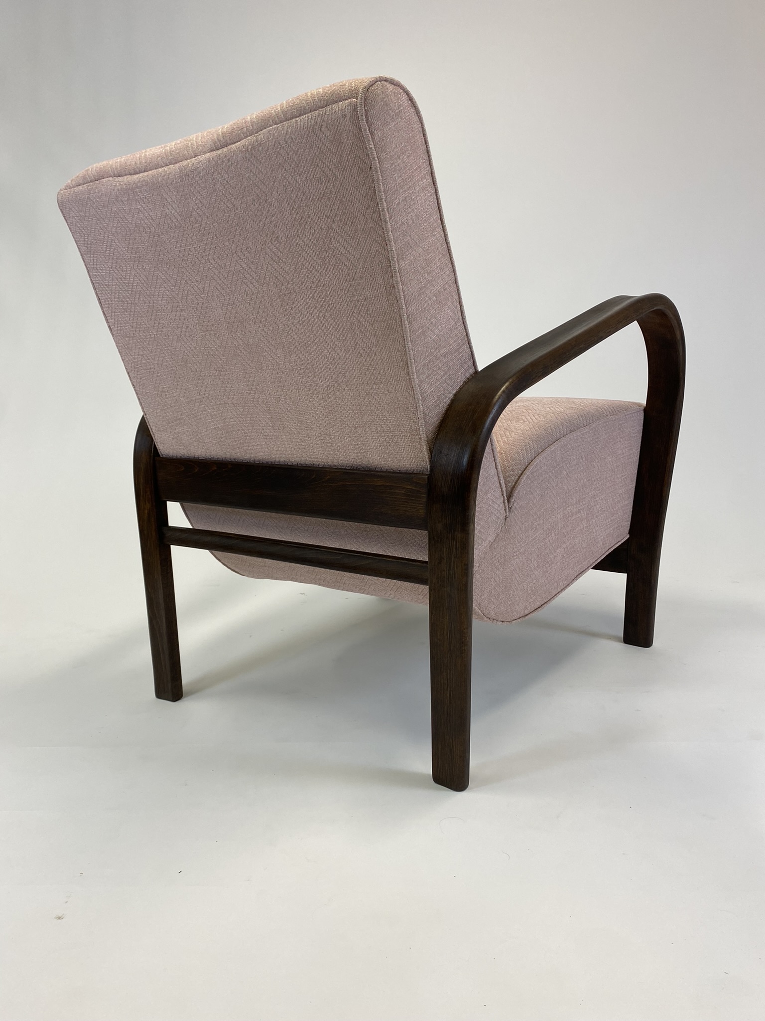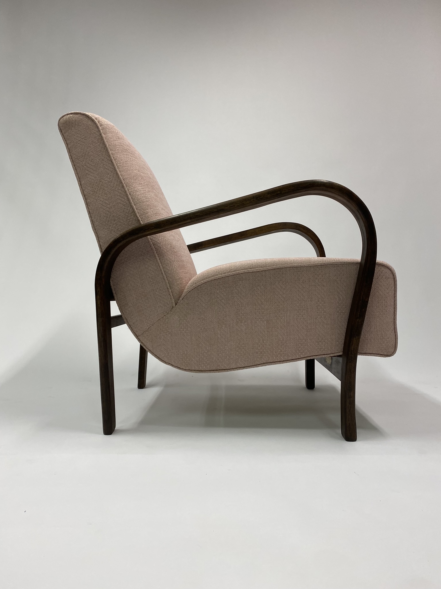 Tento kus prošel kompletní renovací. Dřevěná konstrukce byla odborně zrestaurována a opatřena novou povrchovou úpravou dánským tvrdým olejem, který zvýrazňuje krásnou kresbu bukového dřeva. Sedák a opěrák jsou nově čalouněny kvalitní látkou z Itálie v jemném odstínu, jenž podtrhuje noblesní charakter celého křesla.