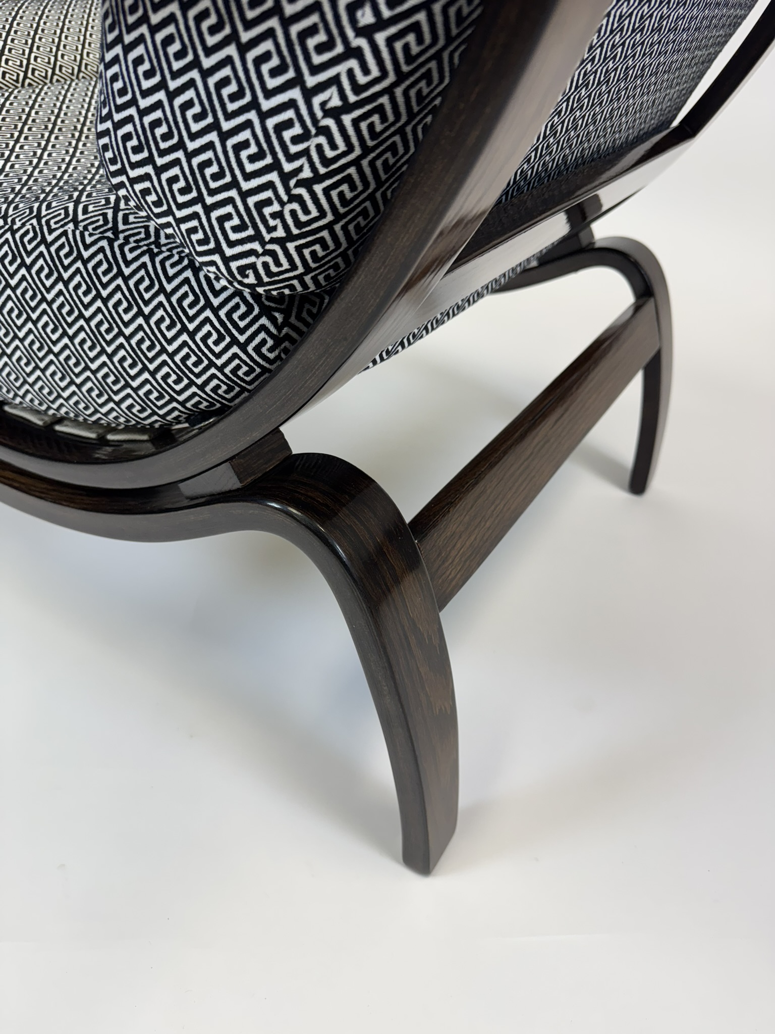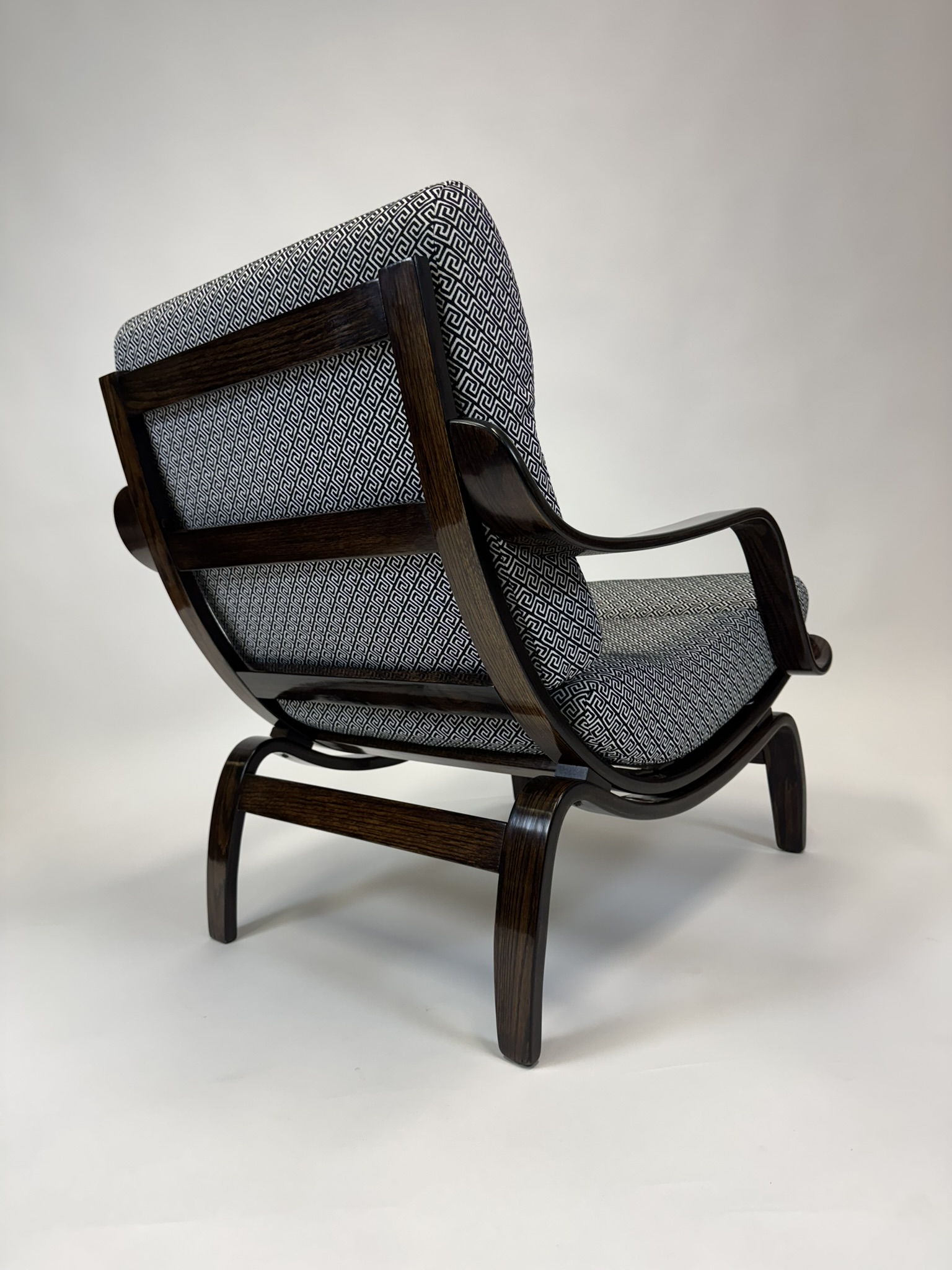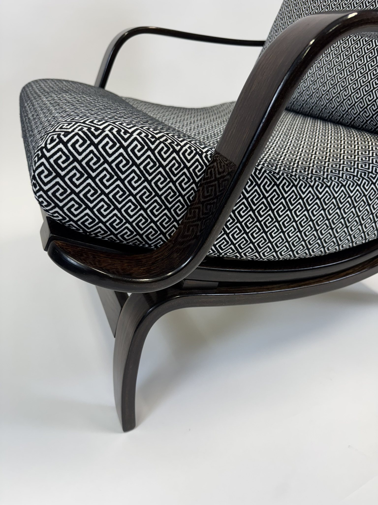 Čalounění bylo nově vyrobeno včetně výplní. Použitá látka pochází ze Španělska – decentní geometrickým vzorem, který doplňuje charakter původního designu.