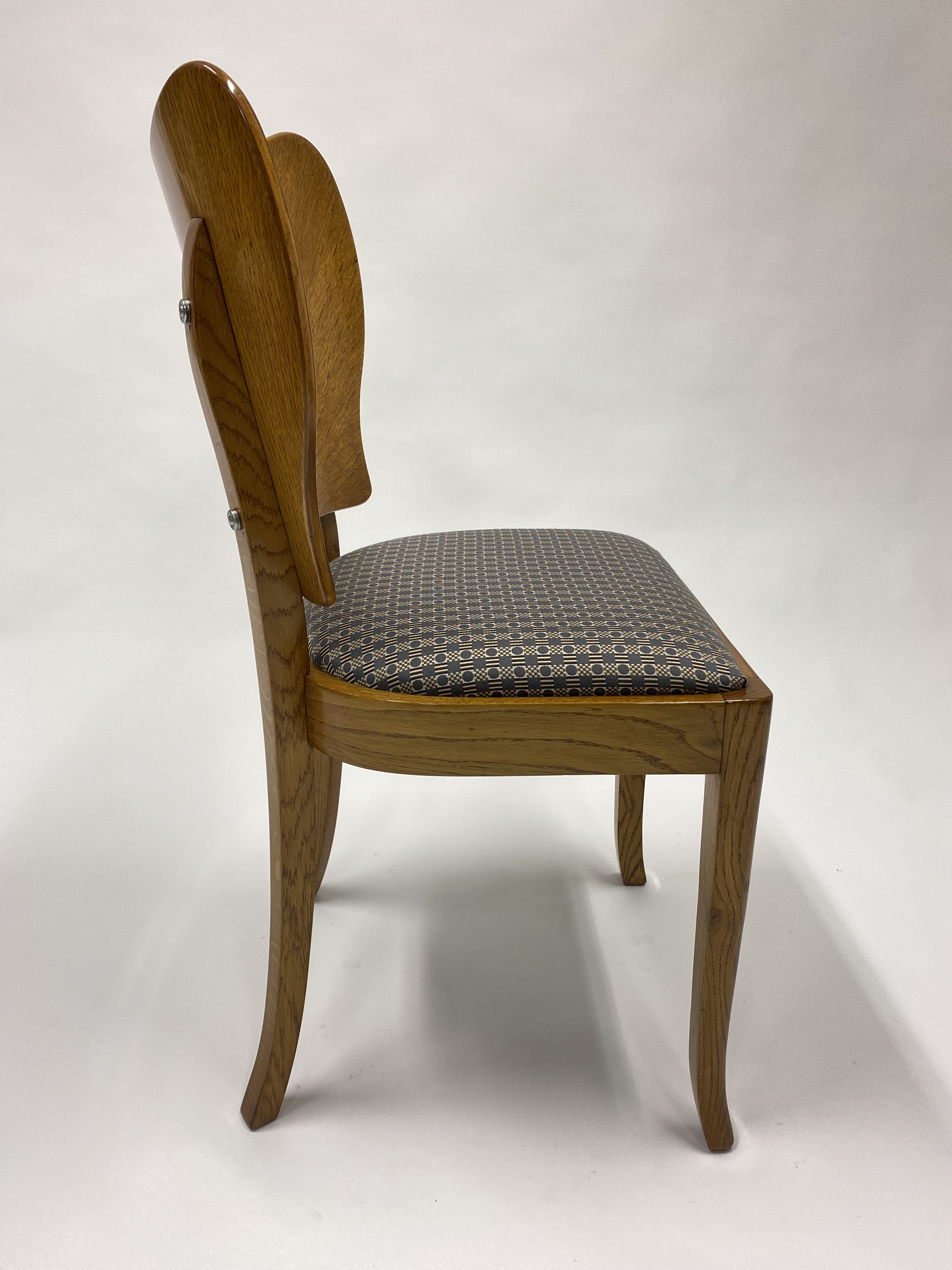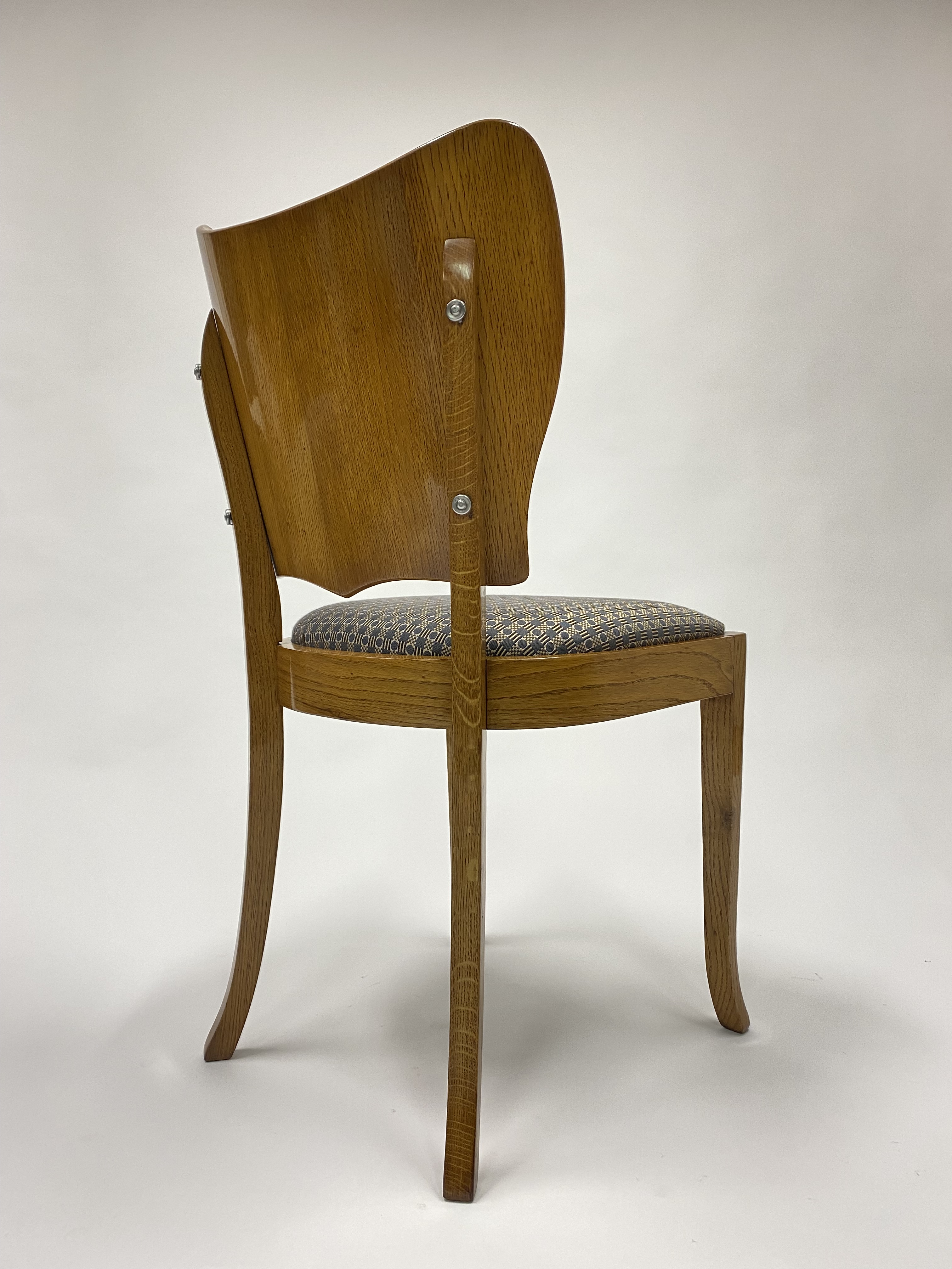 Tato raritní čalouněná židle představuje jedinečný příklad zakázkové výroby z dubového masivu. Široký opěrák je řešen s precizně skládanou dubovou dýhou, která vytváří elegantní kresbu, a na zadní straně doplněn o originální kovové krytky šroubů s ozdobným detailem.
