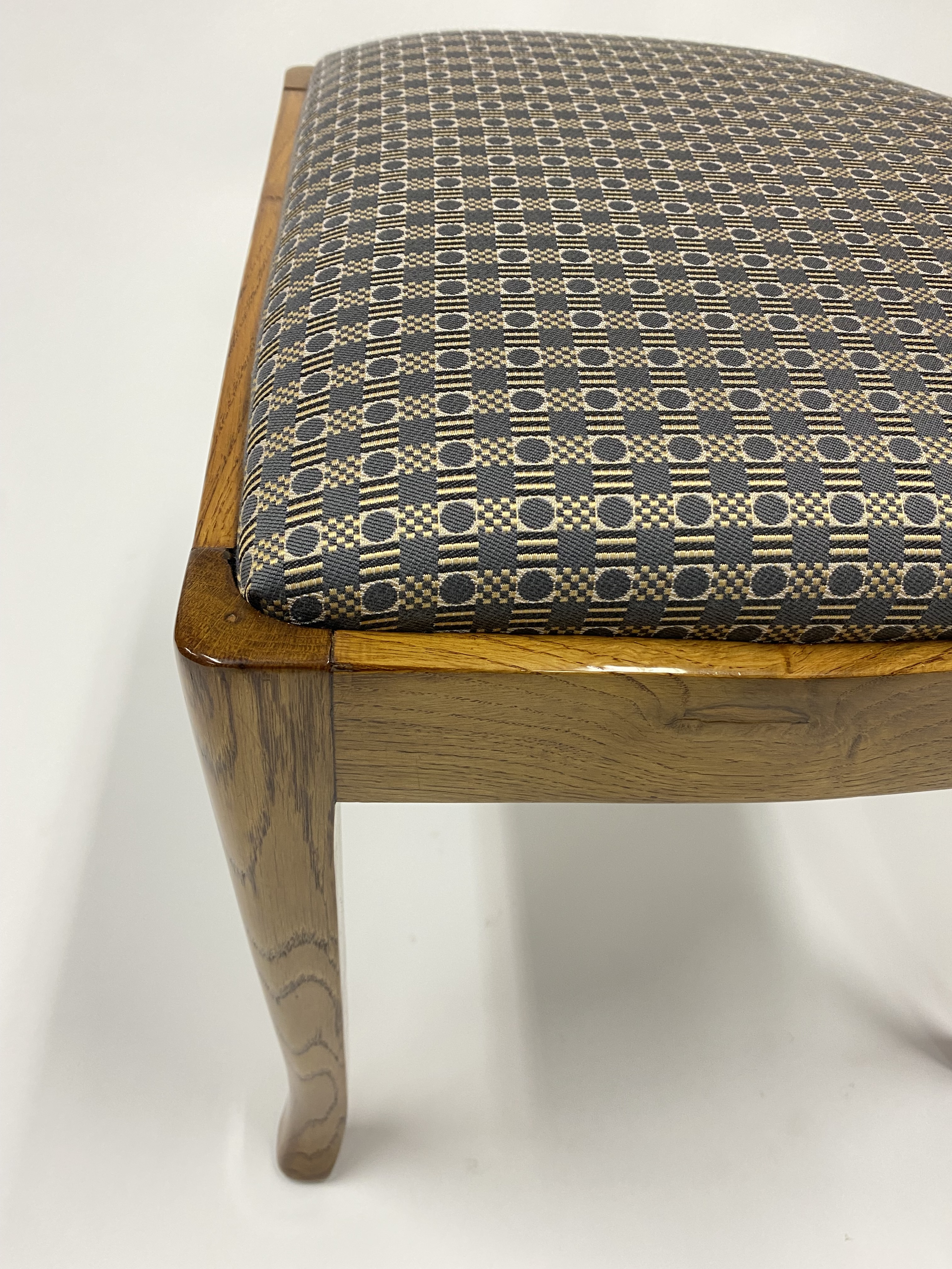 Židle prošla kompletní renovací – povrch byl ošetřen tradiční šelakovou politurou, čalounění nahrazeno luxusní látkou Kolovrat. Výsledkem je solitérní kus, který spojuje historickou hodnotu s moderním komfortem a stane se ozdobou každého interiéru.