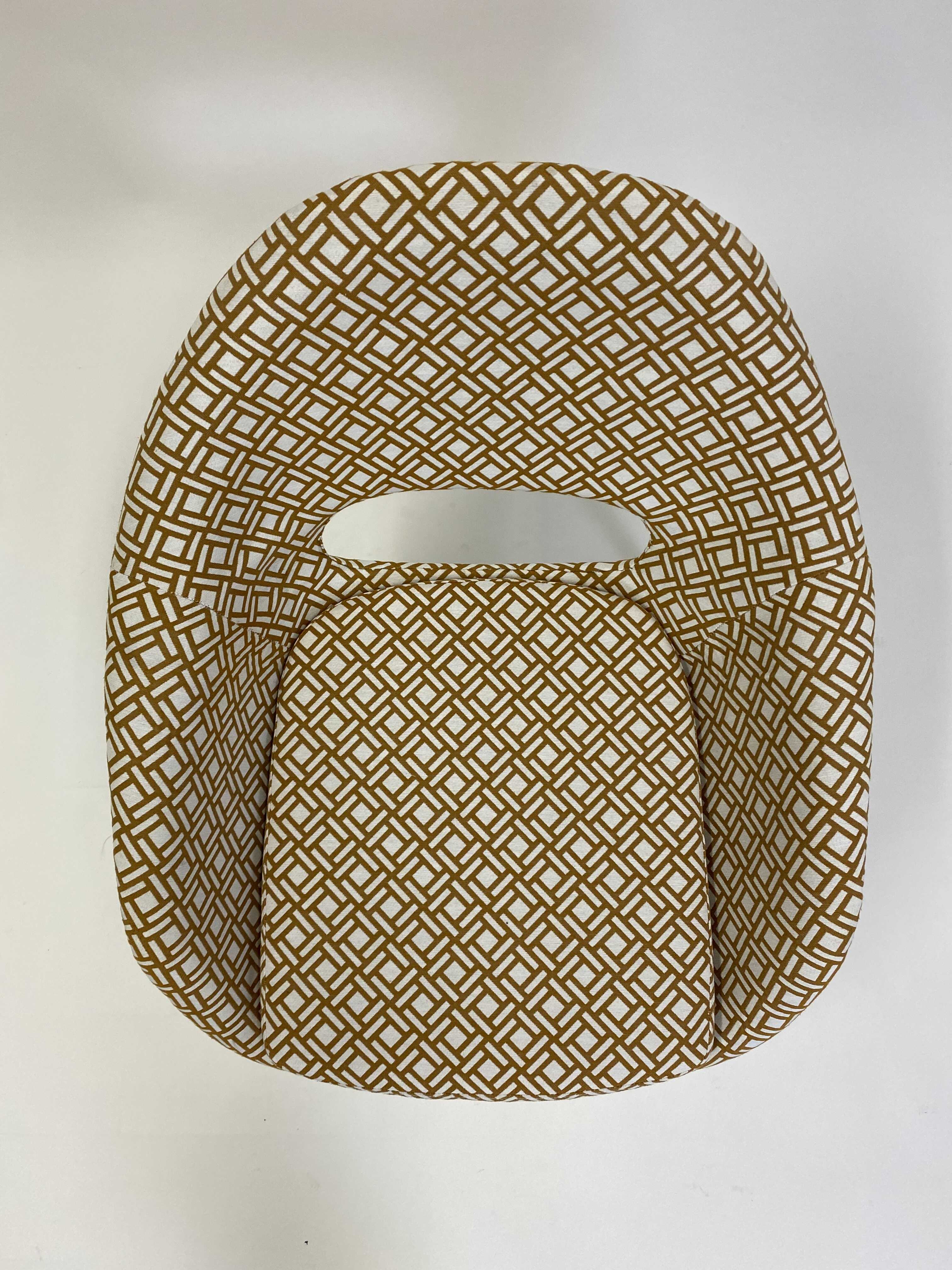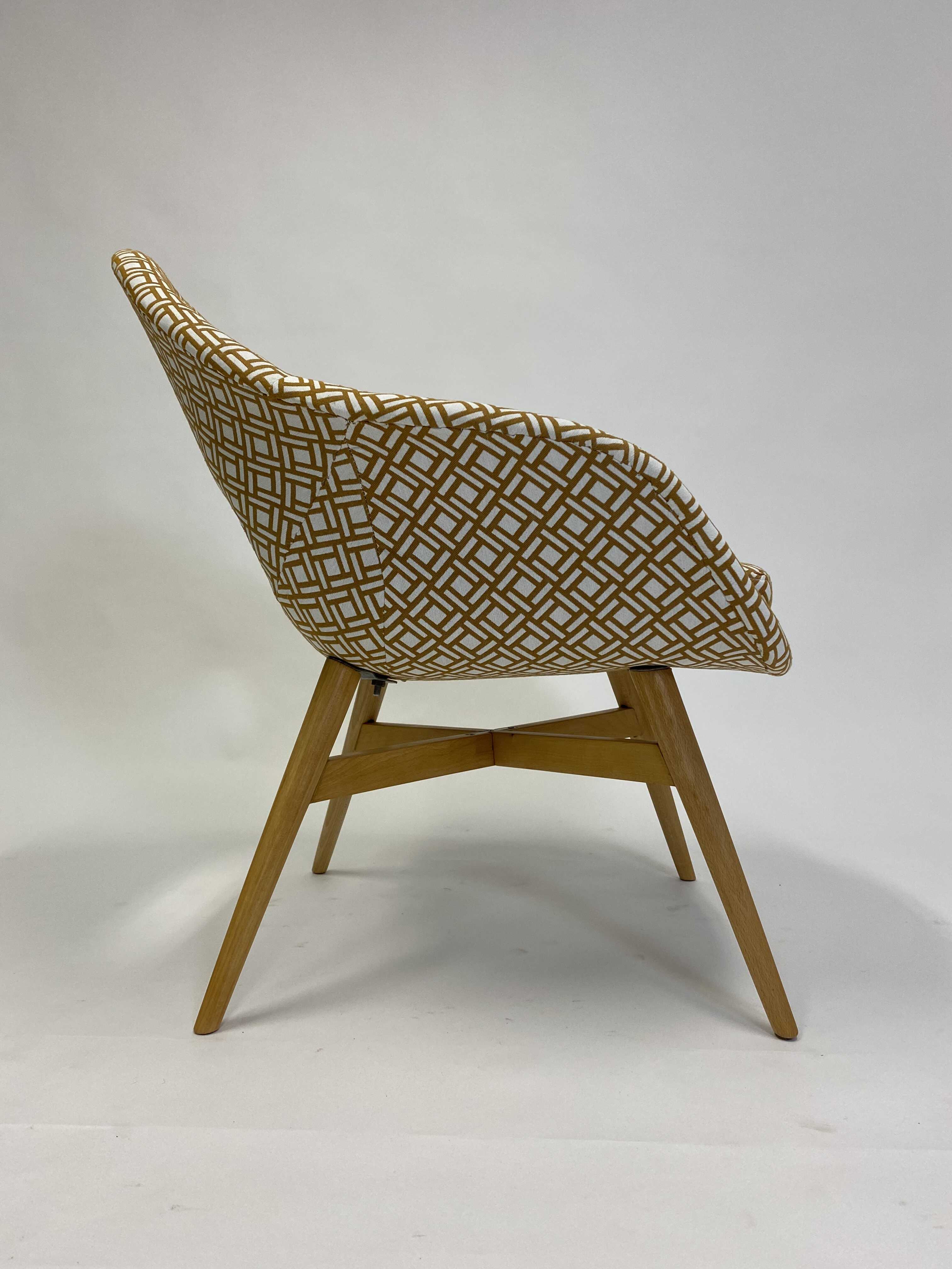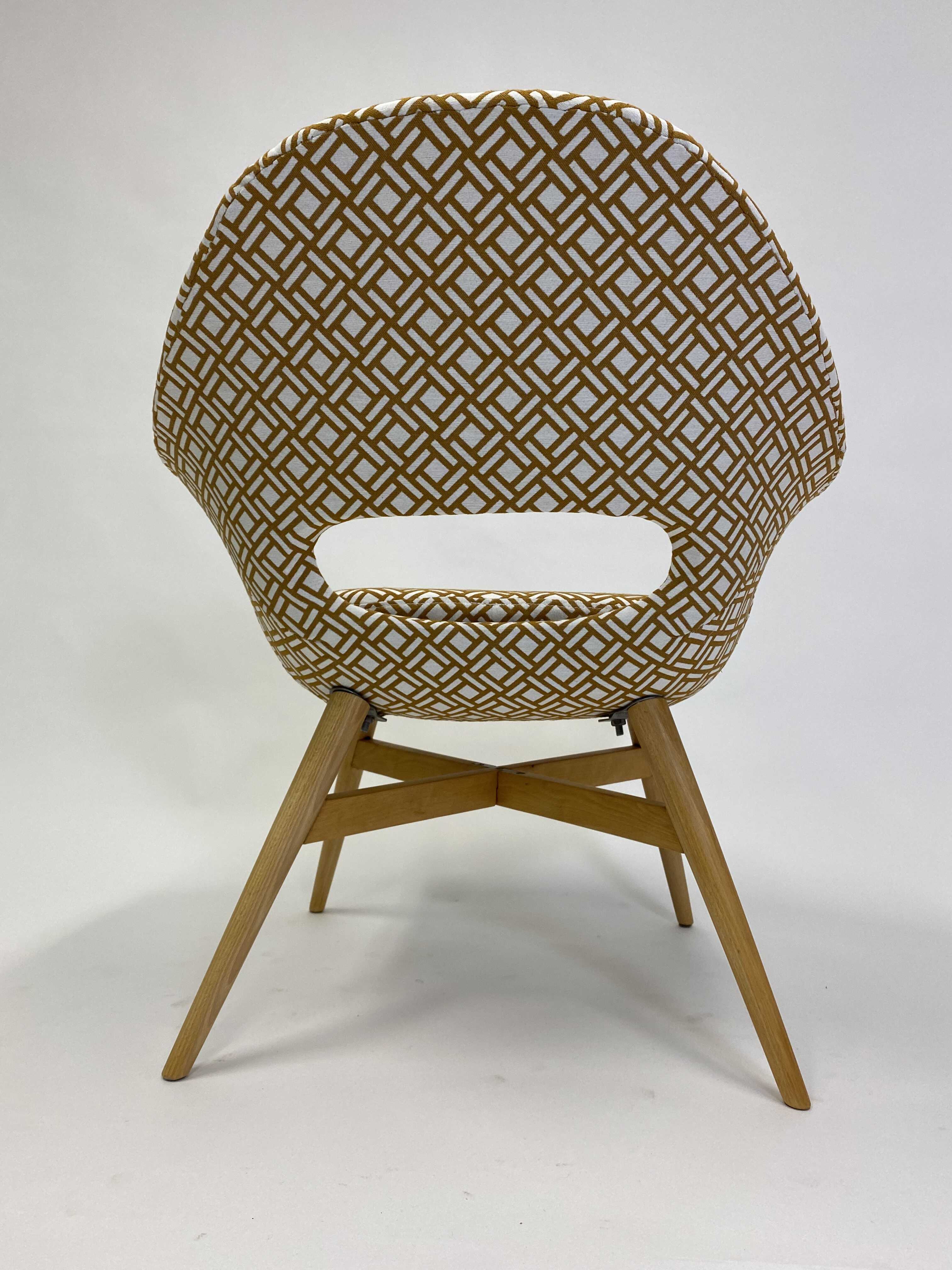 Tento model stojí na elegantní bukové trnoži a byl nově očalouněn kvalitní látkou z Itálie s geometrickým vzorem. Křeslo prošlo kompletní renovací a je připraveno k plnohodnotnému používání.