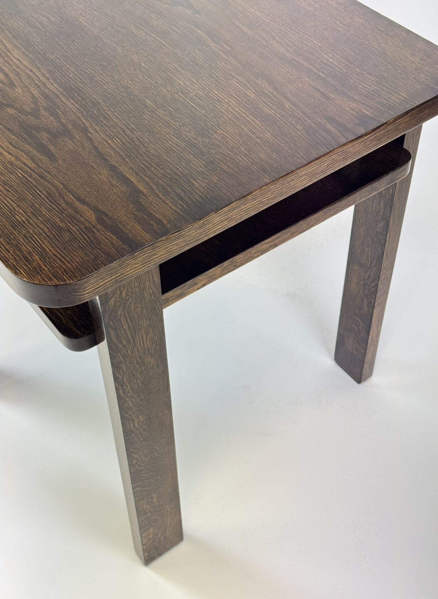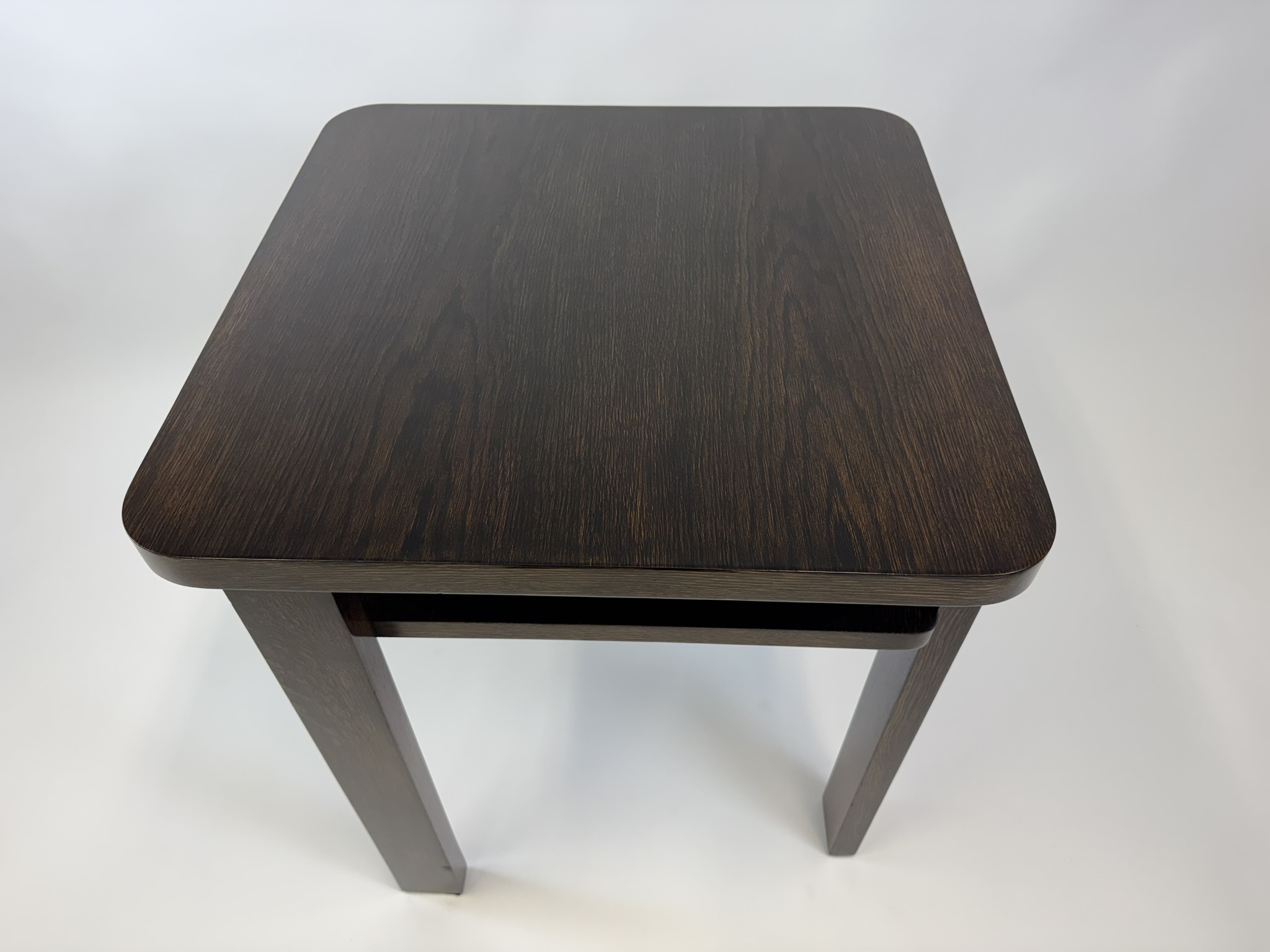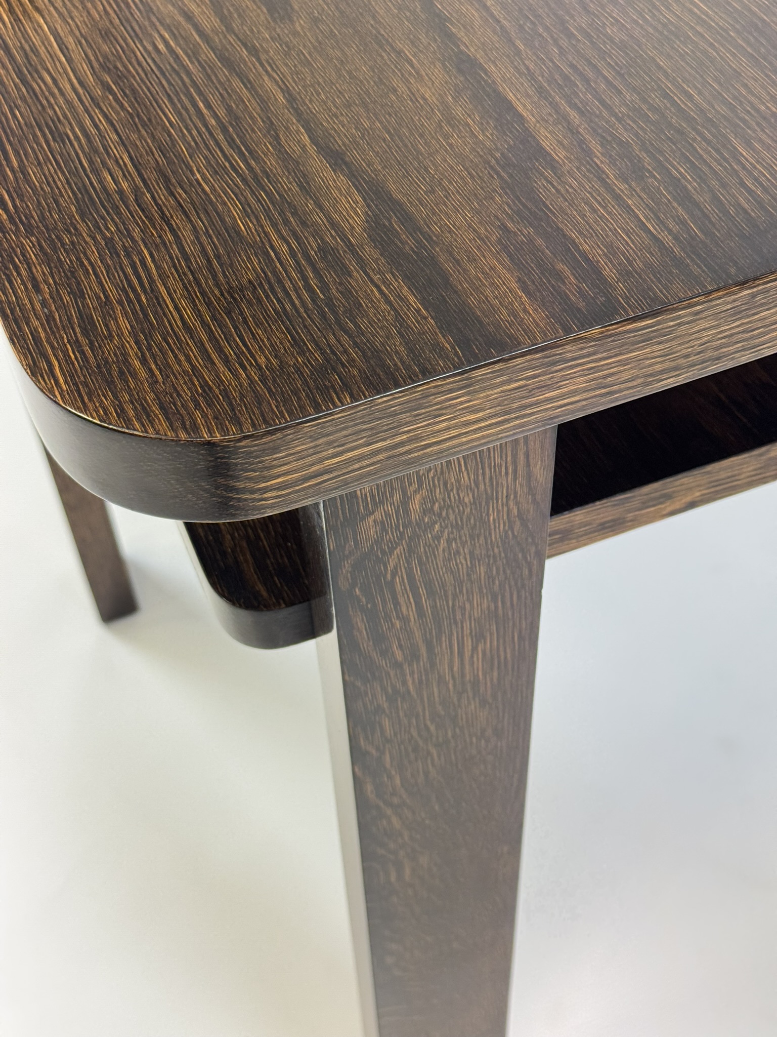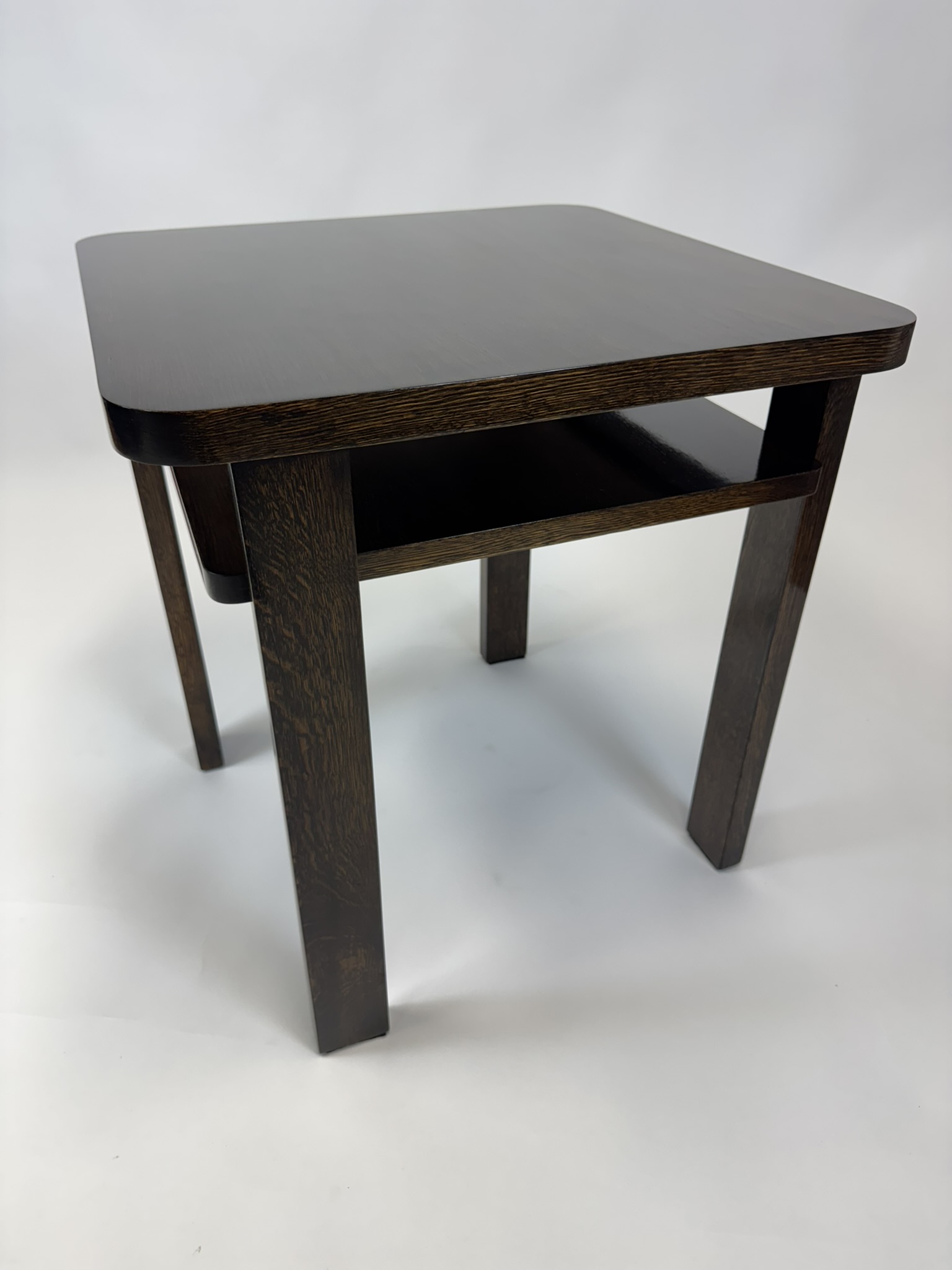 Stolek prošel kompletní náročnou renovací. Povrch je ošetřen tradiční šelakovou politurou, která dodává dřevu hloubku, lesk a elegantní teplý tón. Krásná kresba dýhy je zachována v původní kvalitě, vynikne jak ve sbírce, tak jako solitér v moderním interiéru.