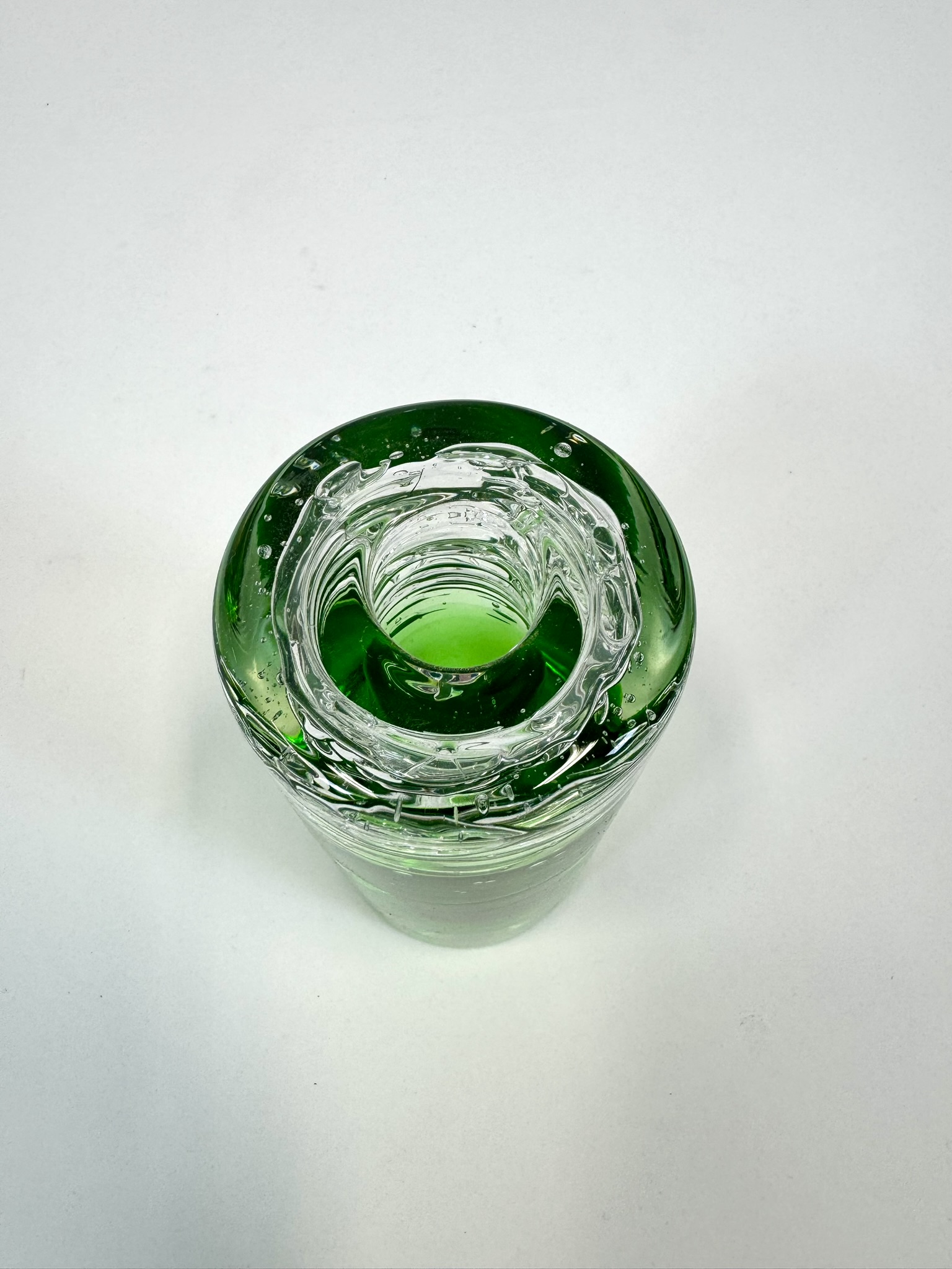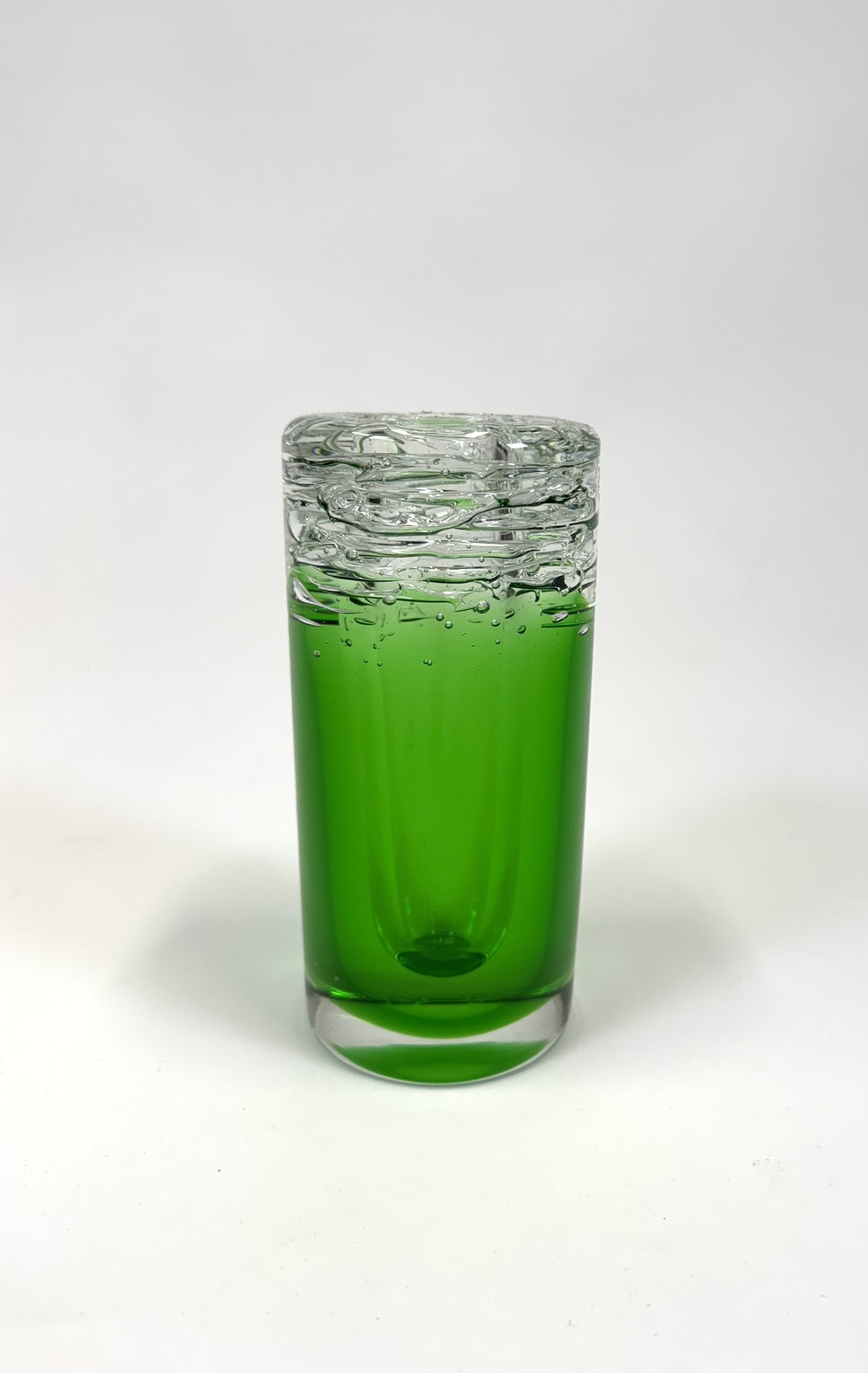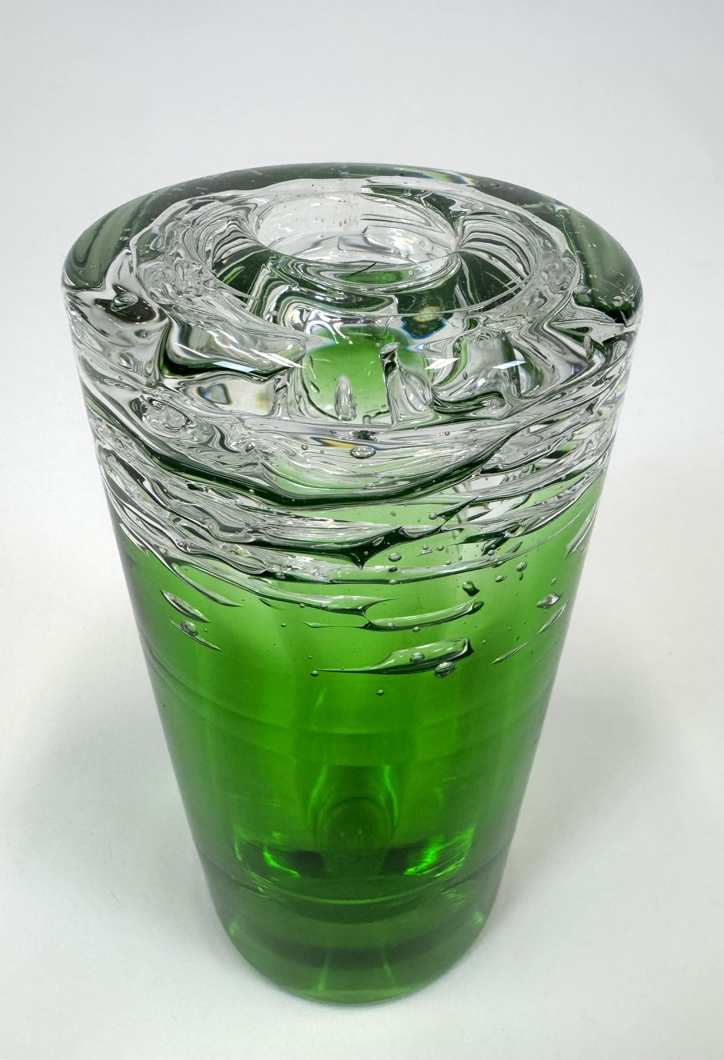 Kombinace sytě zeleného a čirého skla s charakteristickými uzavřenými bublinami vytváří výrazný optický efekt a hloubku materiálu, která se proměňuje podle světla a úhlu pohledu. Váza byla vyrobena ve sklárně Škrdlovice, která je s autorovou tvorbou úzce spjata a patří k zásadním místům českého poválečného sklářství.