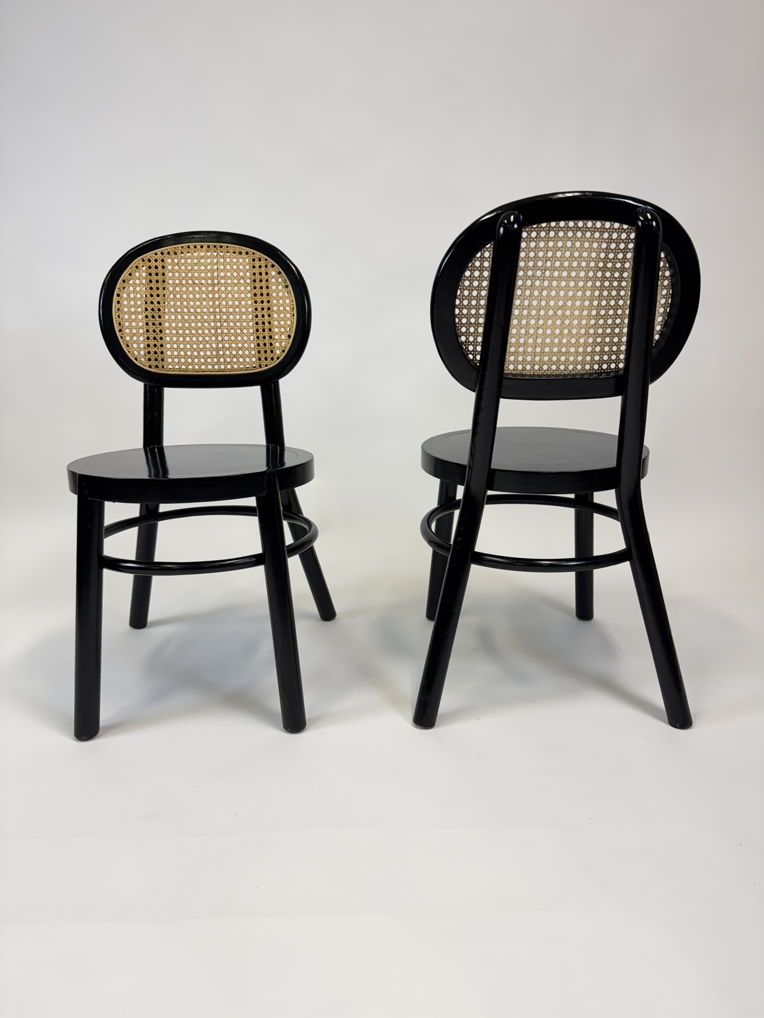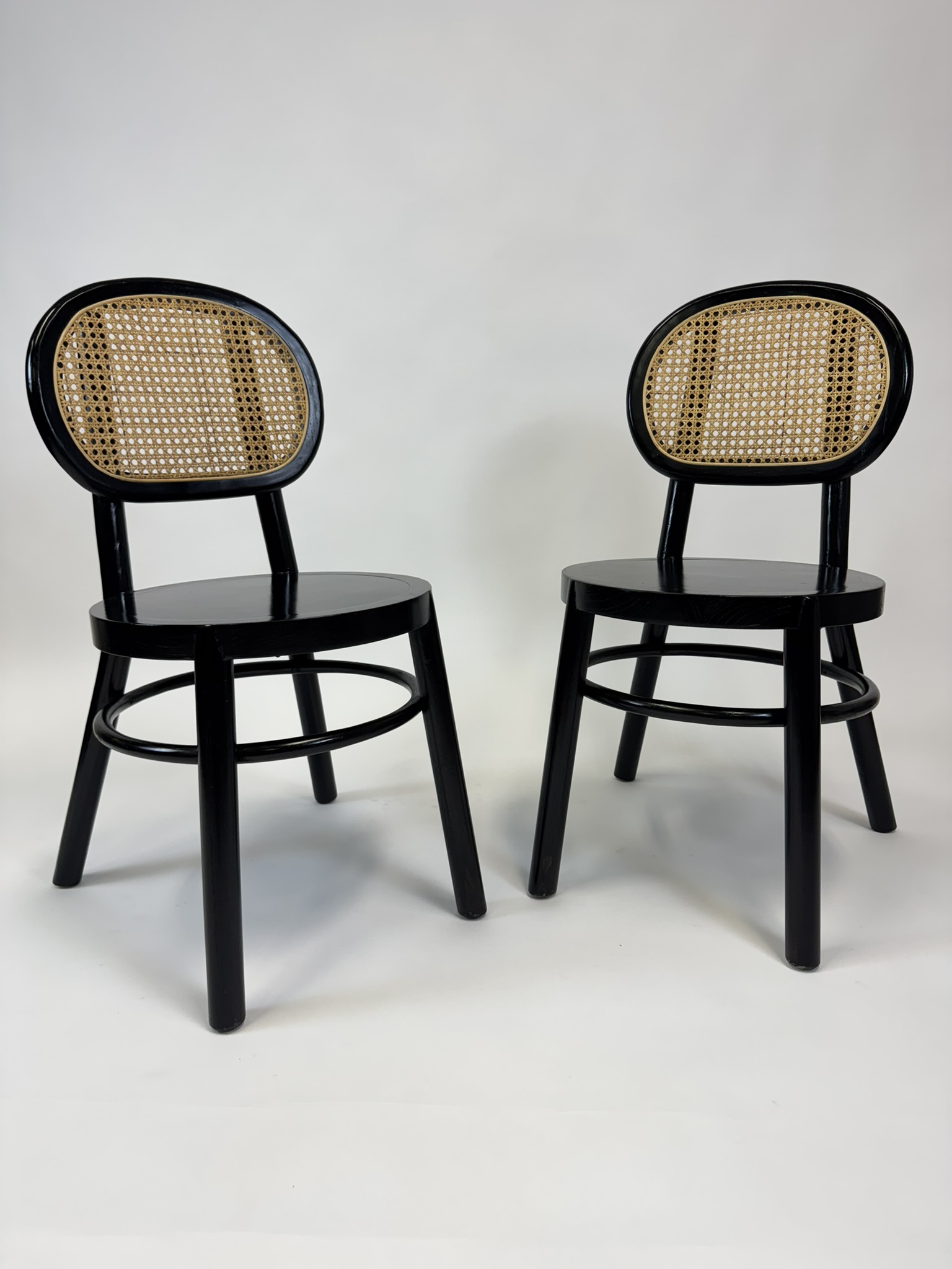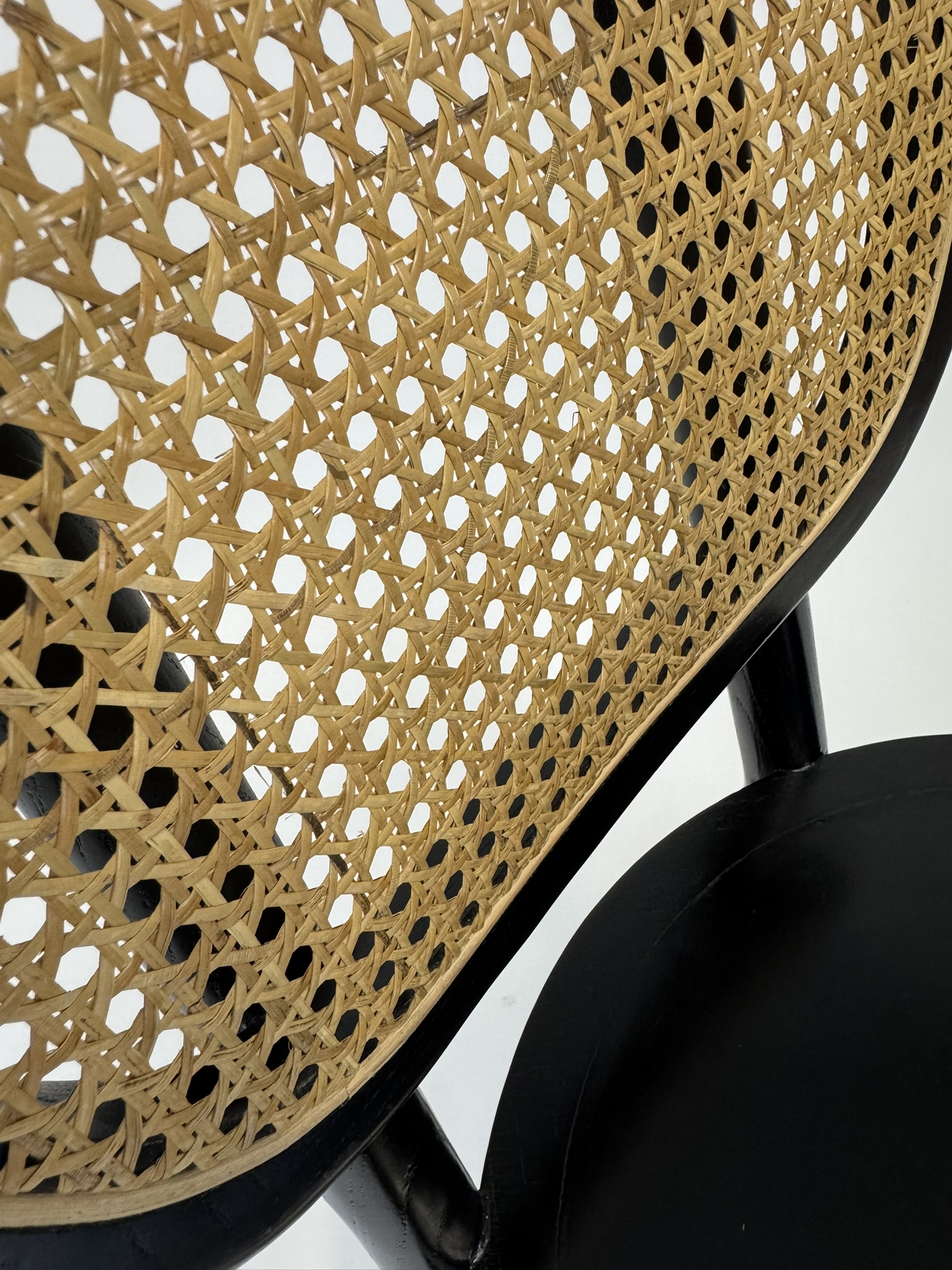 Ratanový výplet dodává židli přirozenou lehkost a vzdušnost, zatímco černé masivní dřevo působí stabilně a nadčasově. Každý kus je ručně vyráběný, s důrazem na detail a pohodlí při sezení.